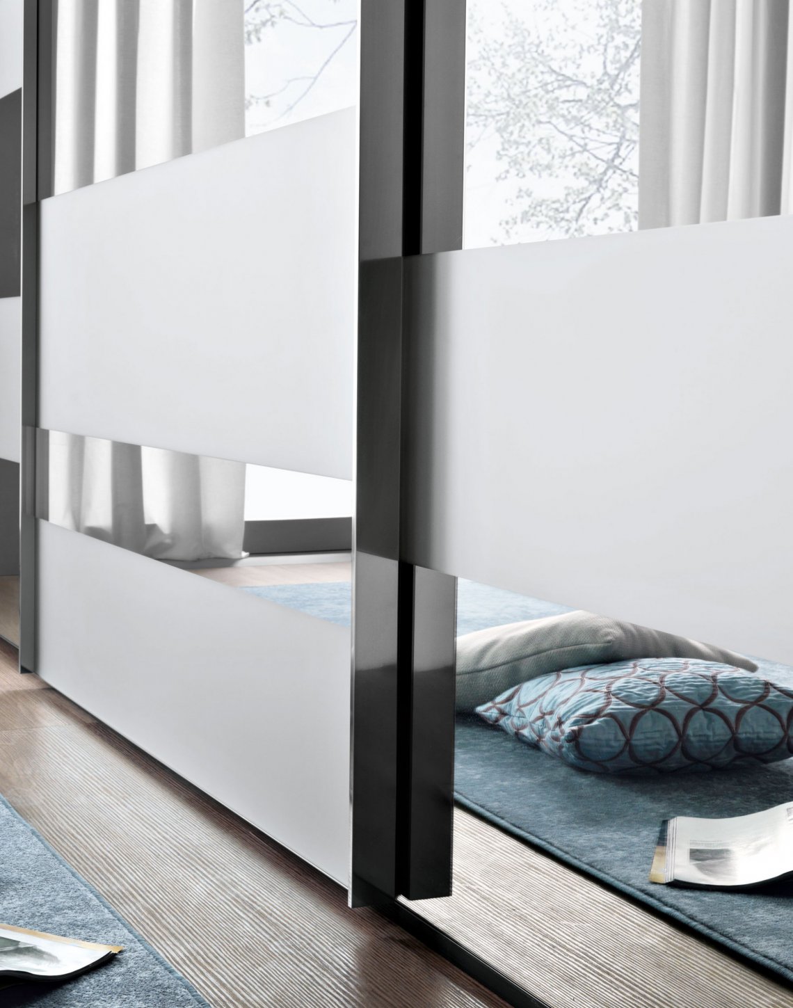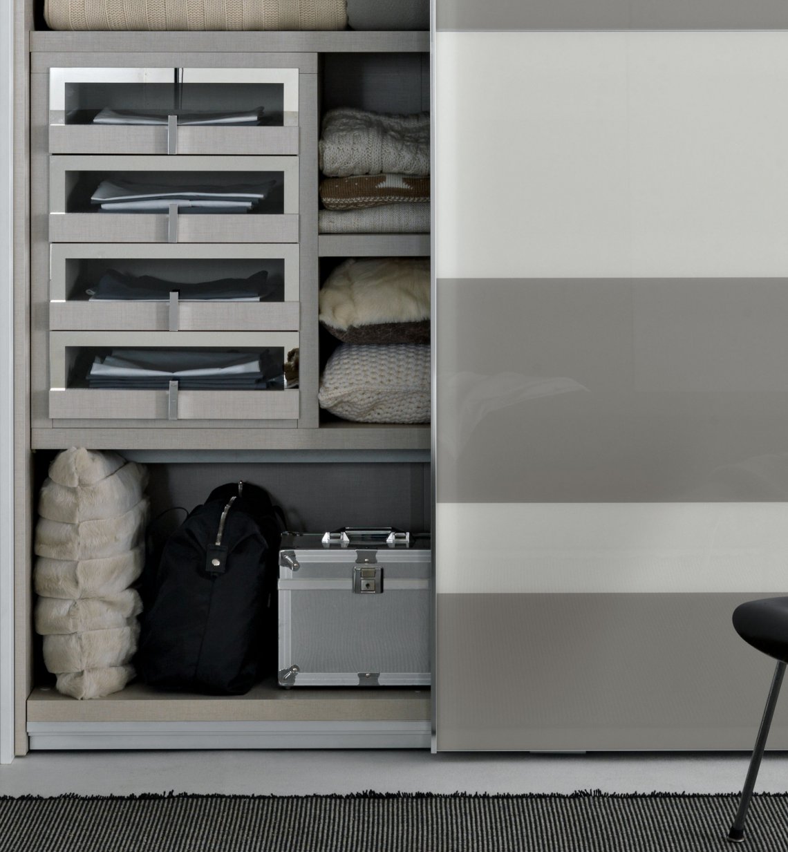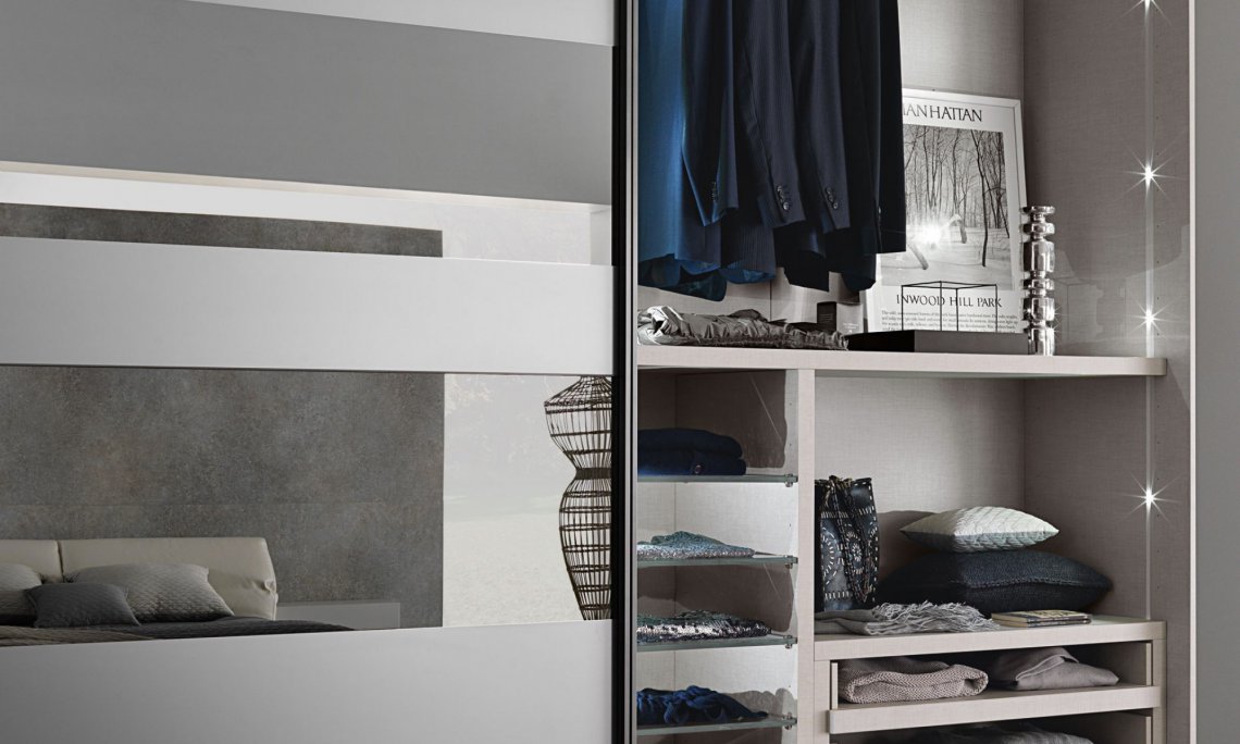布置房間時,寬敞的衣櫥絕對是一個亮點。Segmenta New移門, 以玻璃、亞光和高光烤漆的交替運用,使衣柜實現個性化。