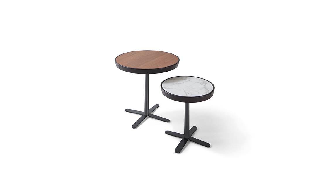 KEW系列小圓桌,金屬和其他材料的組合讓人聯想到維多利亞時代英國皇家植物園里的大型金屬構架的溫室。小桌的金屬結構看上去非常簡潔,卻隱藏著略微傾斜的四腿底座小巧的精致構造,四腿底座隱藏了內嵌的支腳。