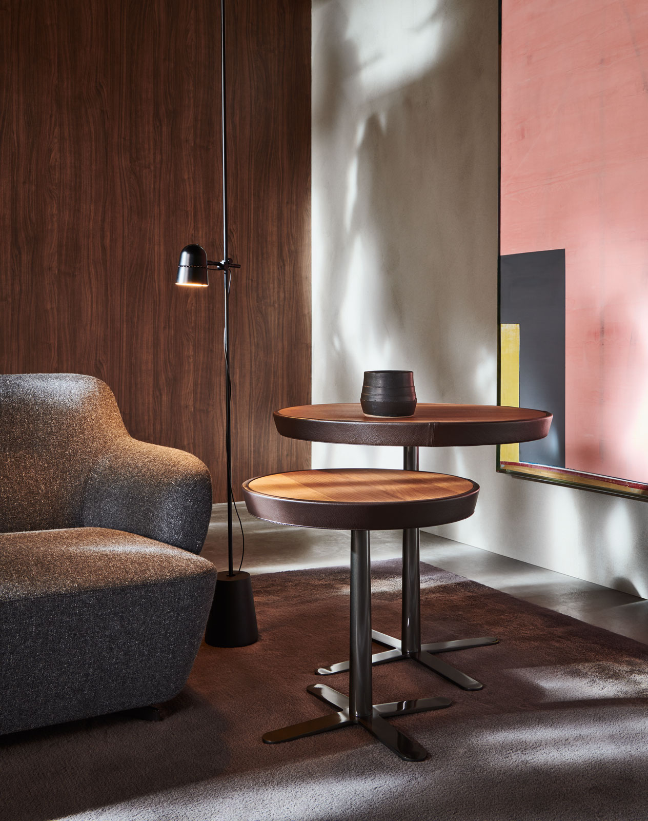 小桌有兩種規格,直徑50和70厘米,高度50和63厘米,可以部分重疊擺放。