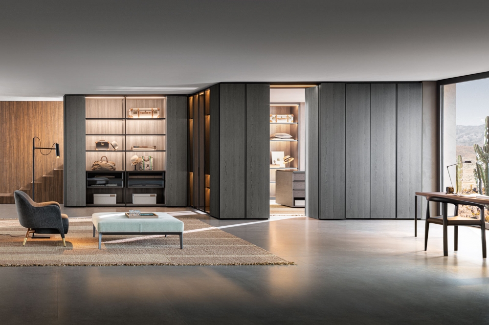 GLISS MASTER 衣柜系統(tǒng)裝備了一種新型的柜門,柜門配有一套精巧的開合機構: 系統(tǒng)7。這個設計項目的核心是一個獲得專利的折疊機構,可以將柜門輕松和安靜地 從最初的位置拉到隔間的一側,讓隔間完全打開。柜門打開并且自身折疊,與相鄰的 隔間平行對齊,不會占用隔間前面的空間。系統(tǒng)7的機構可以使用厚重的漆制、木制或立面定制酸性蝕刻的玻璃柜門。