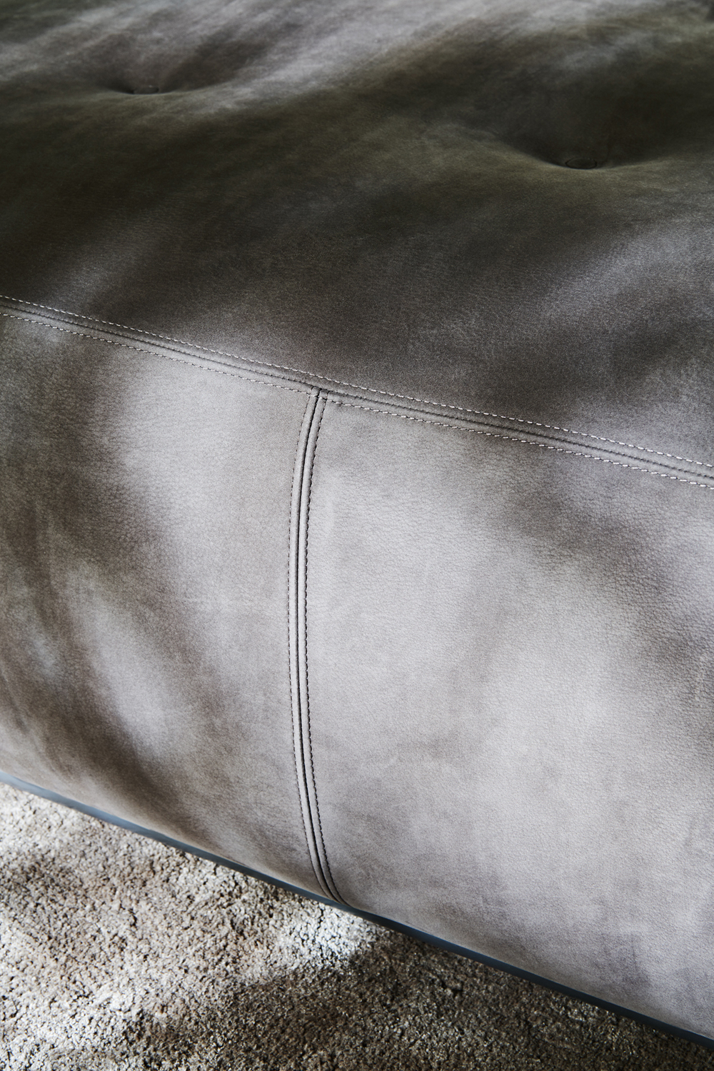 兩種不同而互補(bǔ)的版本,均由恢弘而硬朗的幾何形式構(gòu)成,手工縫制的座位點(diǎn)綴其中。一個(gè)是懸空的版本,座位是靠錫金屬打造的金屬底座支撐。另一個(gè)是席地版本,最有安全感的幾何形狀搭配幾不可見的錫金屬邊框點(diǎn)綴。