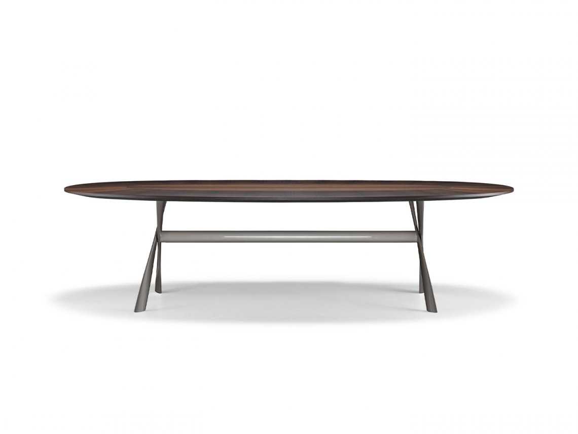The aluminium frame in several contemporary finishes, such as black chrome and zinc, supports elegant rectangular or oval tops of different sizes enriched with wood or marble, selected from the Molteni&C collection