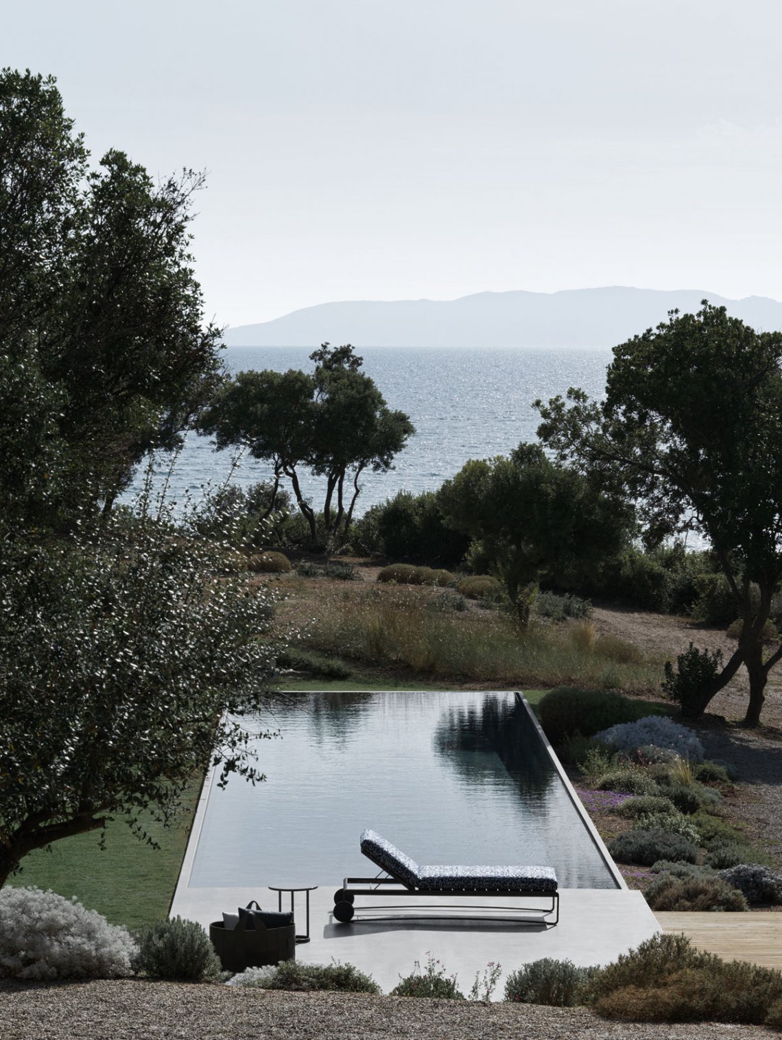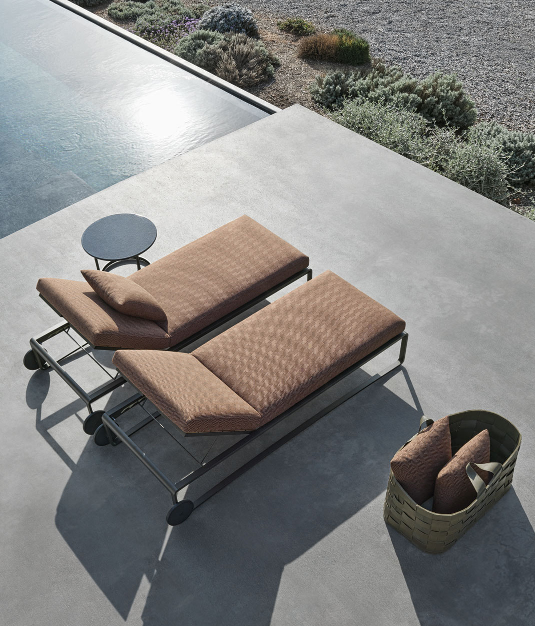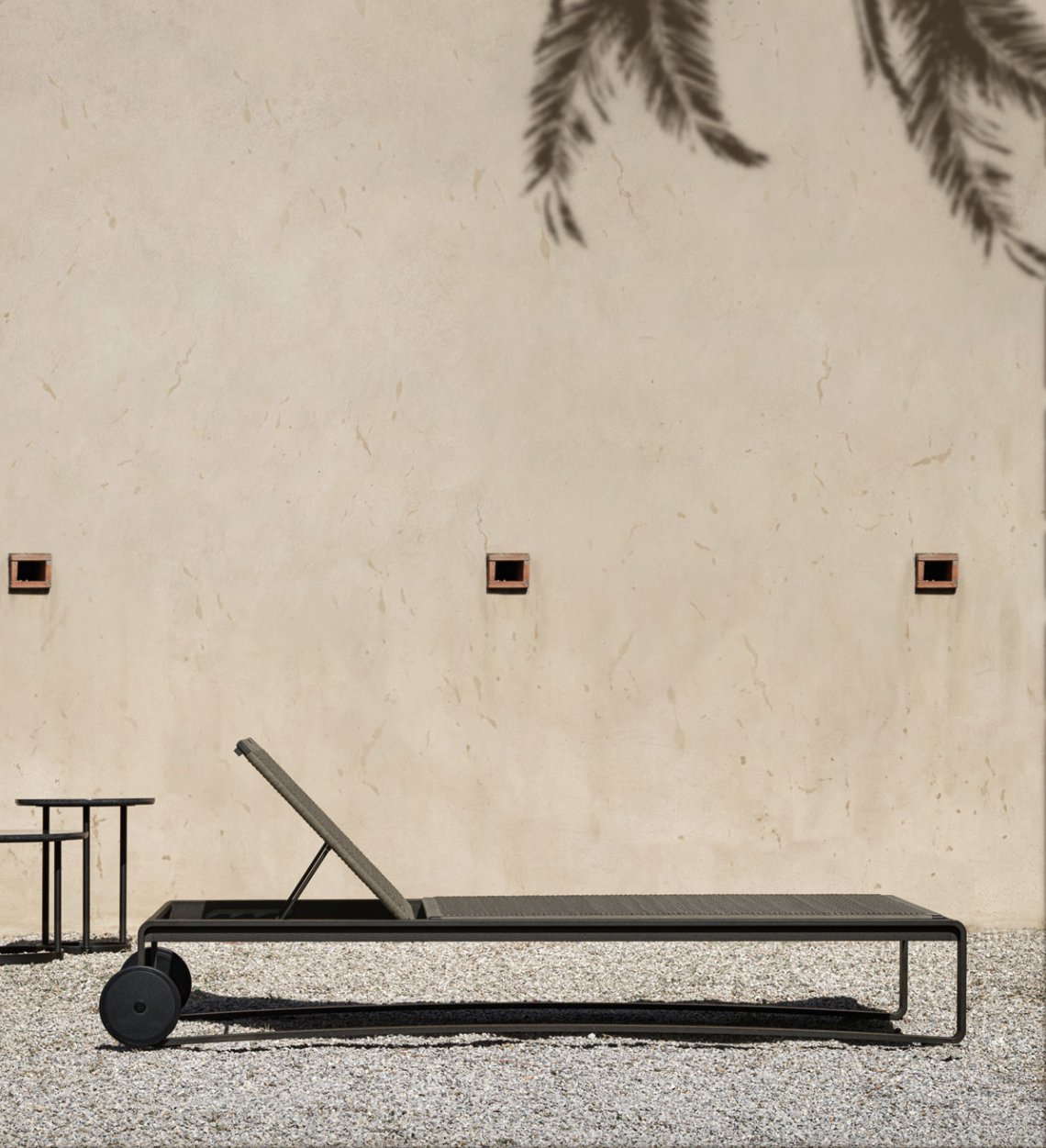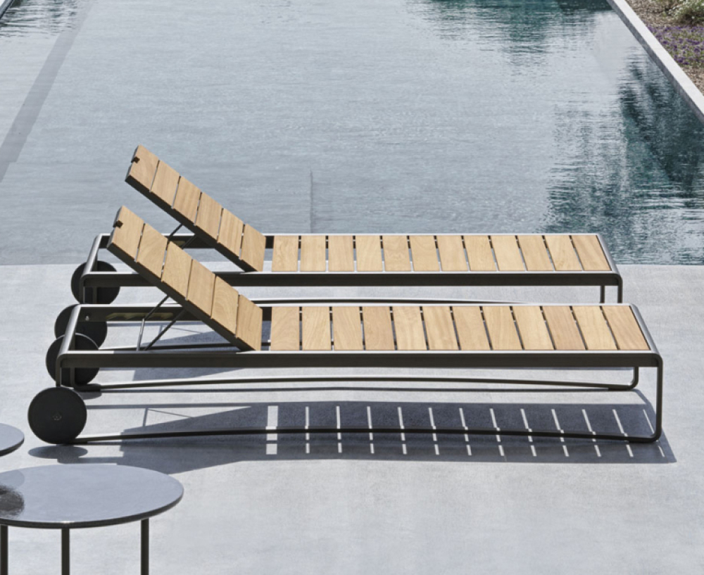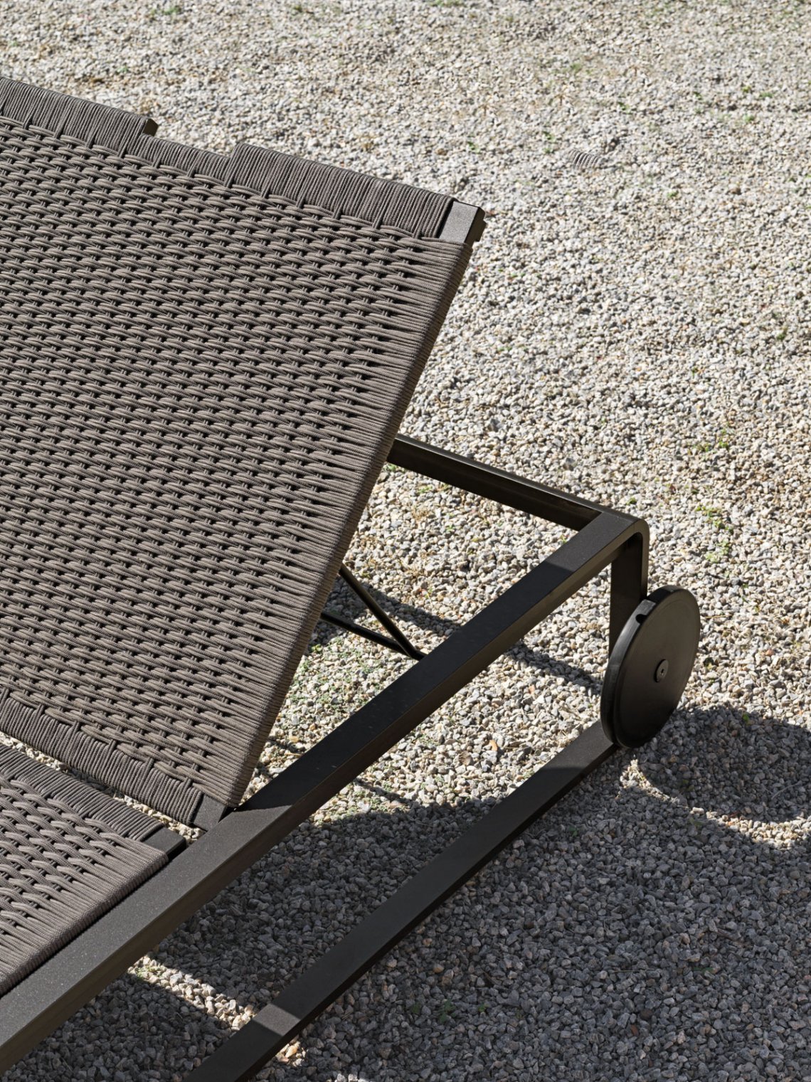 The sun sunbed, the archetype par excellence of outdoor furniture, interprets all the elements that characterise the aesthetics of the Timeout Collection, re-proposing the theme of the burnished painted aluminium band, running along the entire profile, and the traditional motif of the polypropylene rope weave.