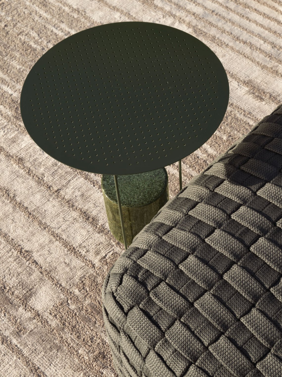 In its outdoor guise, Panna Cotta features a stainless-steel frame with a perforated top, supporting a base in Lava Stone. The vitreous inserts of the Etna lava stone, used for the oven-baked enamelling of the surfaces, come from the crushing of recycled glass from TV and PC monitors. The coffee table is available in anthracite, olive green and desert yellow is available in two rounded tops.