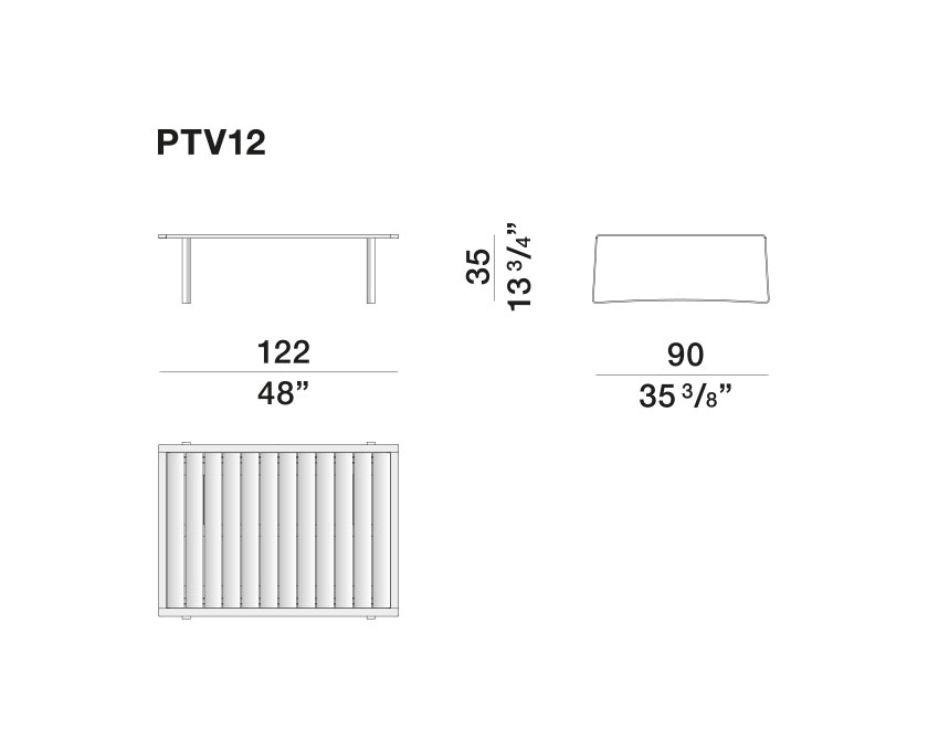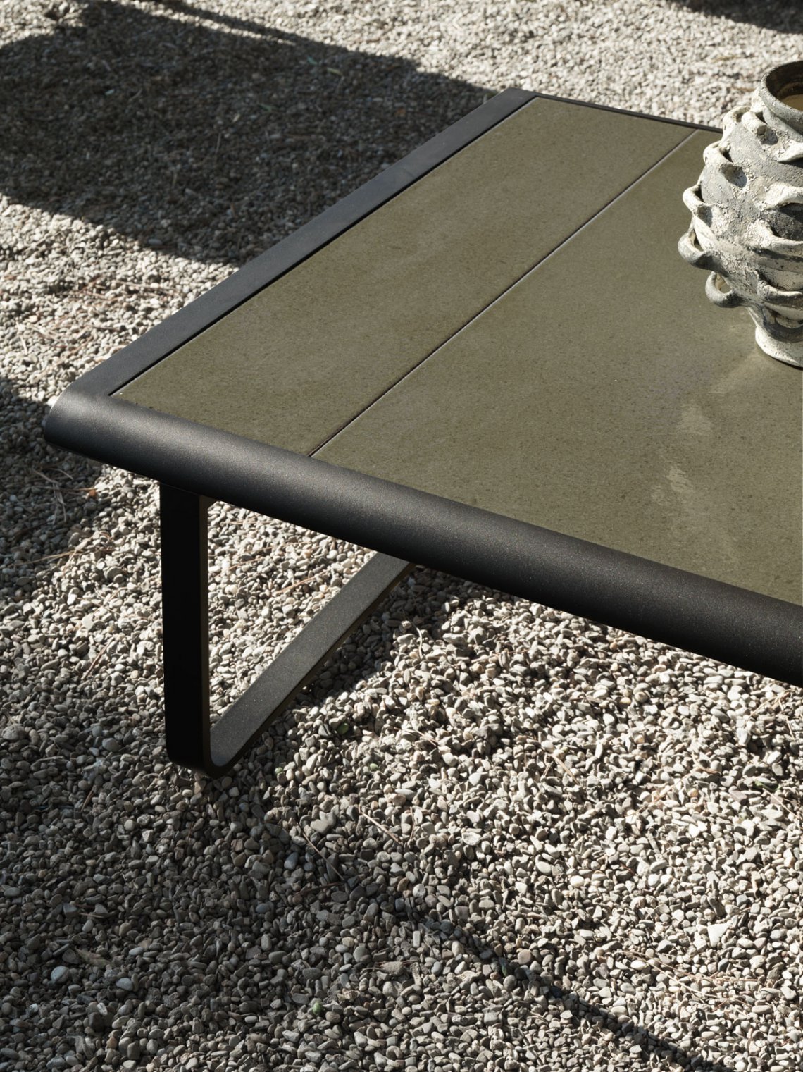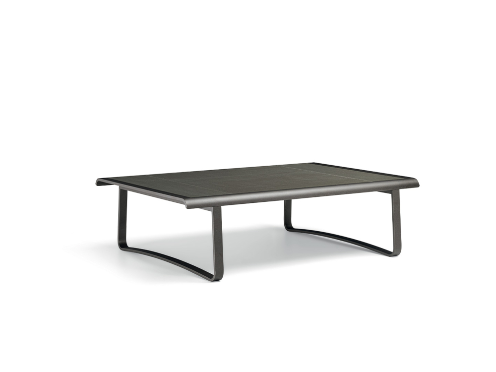 Completing the Timeout Collection is a large low table in two widths, for versatile, intimate or convivial outdoor living spaces. It picks up on the aesthetic motifs of the collection such as the burnished aluminium band, profiles and rounded corners. The support bases, obtained from the continuous run of the same band, are set back from the top to make it visually lighter, as if suspended.