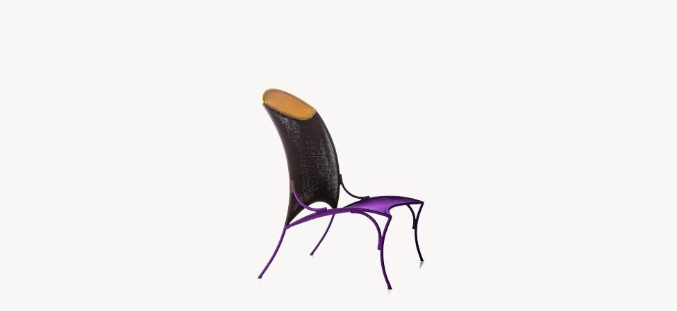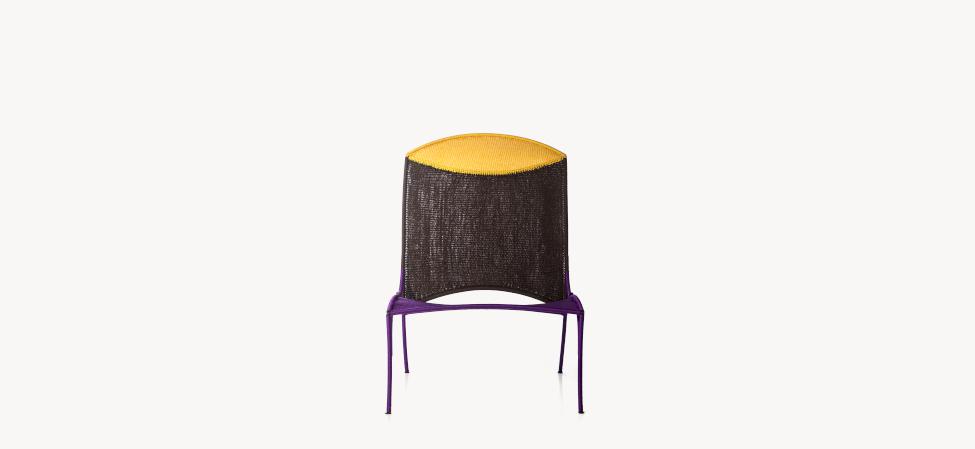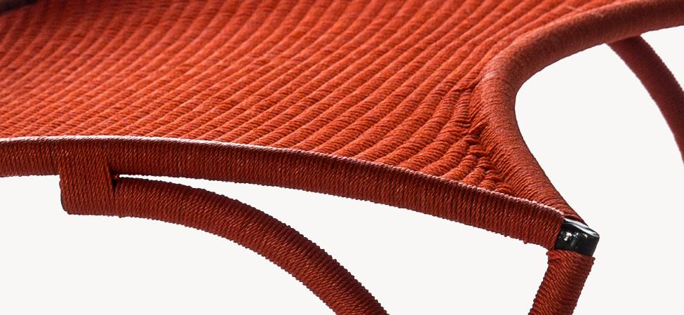 Struttura in acciaio verniciato e fili colorati in polietilene intrecciati a mano.