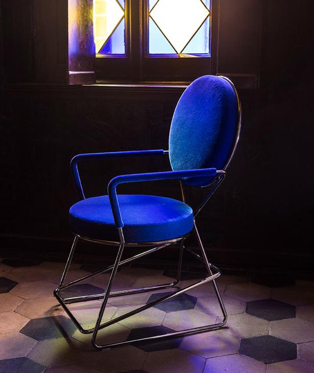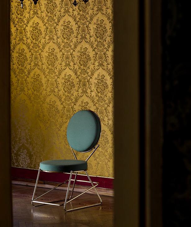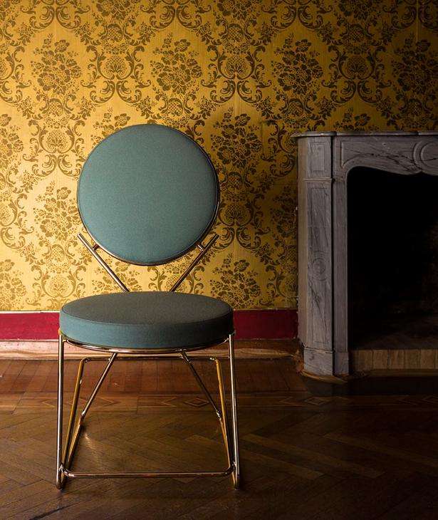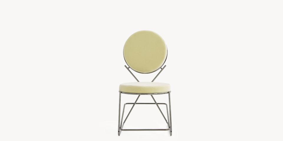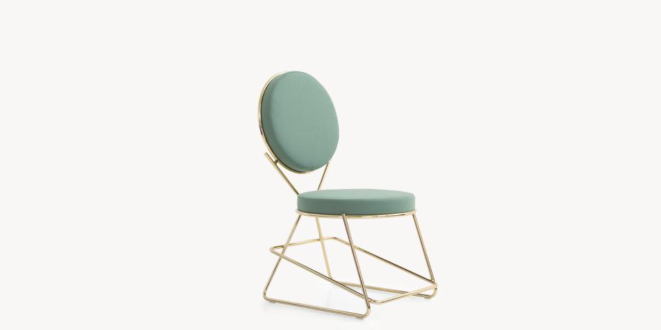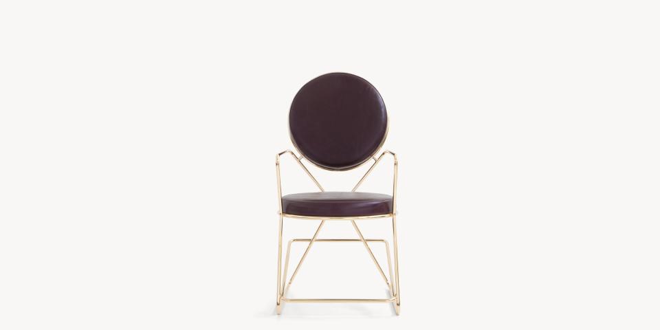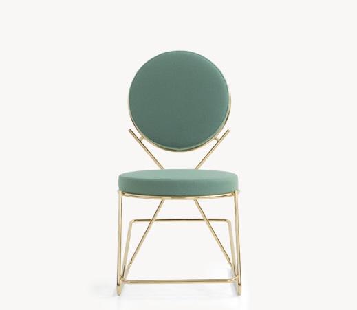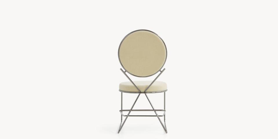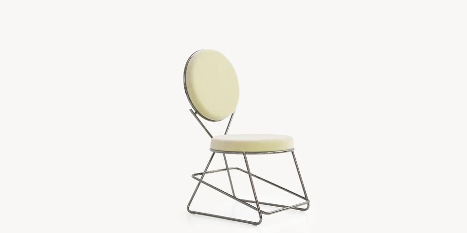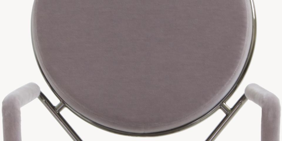 Due cerchi, due moduli elementari innestati in una geometria costruttiva di ispirazione déco, comunicano apertamente la tendenza alla massima semplificazione formale. è il preludio a una produzione industriale di altissima qualità, un’elegante economia di volumi espressa dalla possibilità, offerta dalla struttura in tubolare di acciaio cromato, di declinare il progetto in una famiglia di sedute completa. Nascono così una sedia e uno sgabello, con e senza braccioli, ai quali si aggiunge un divanetto a due posti, raffinata evoluzione formale dettata dalla classe e dal buon gusto. è un ritorno all’ordine, transizione verso un linguaggio lussuoso e sintetico insieme.