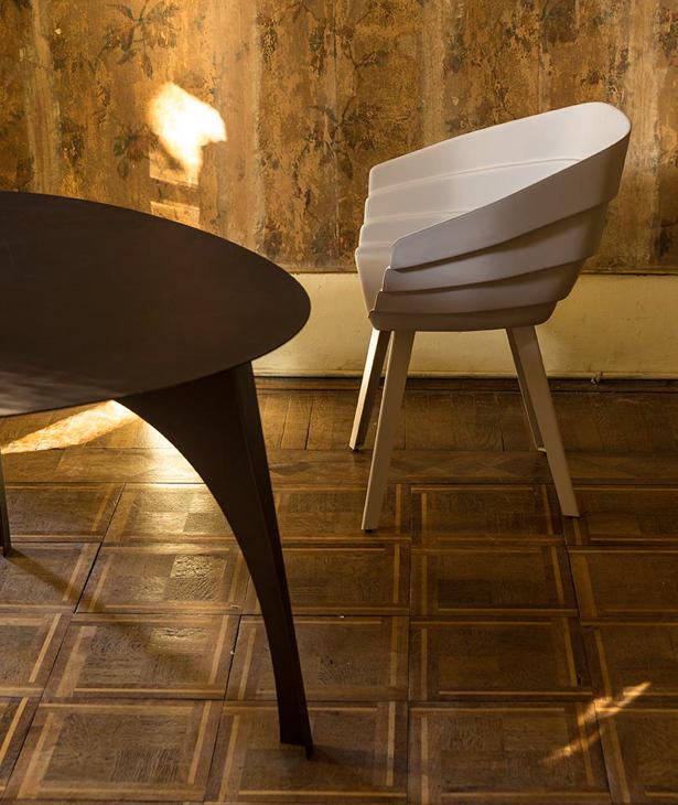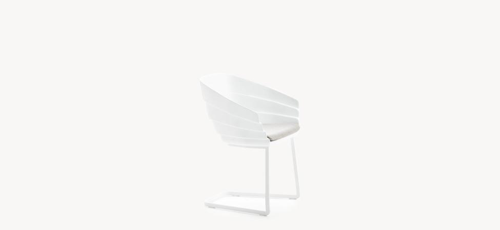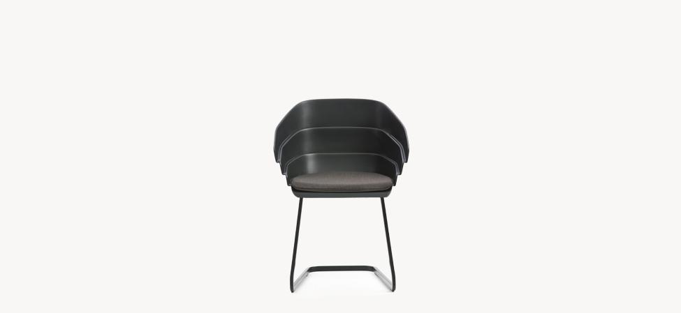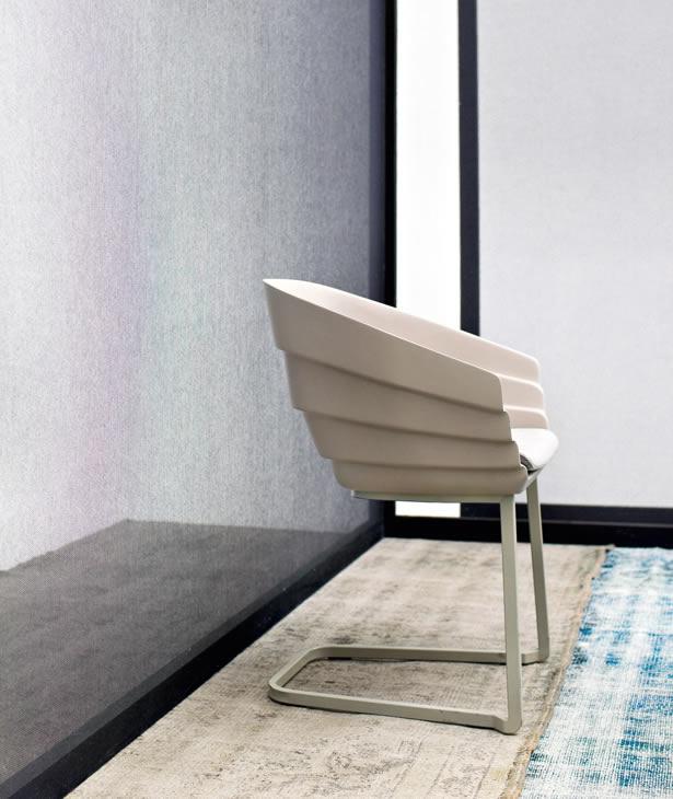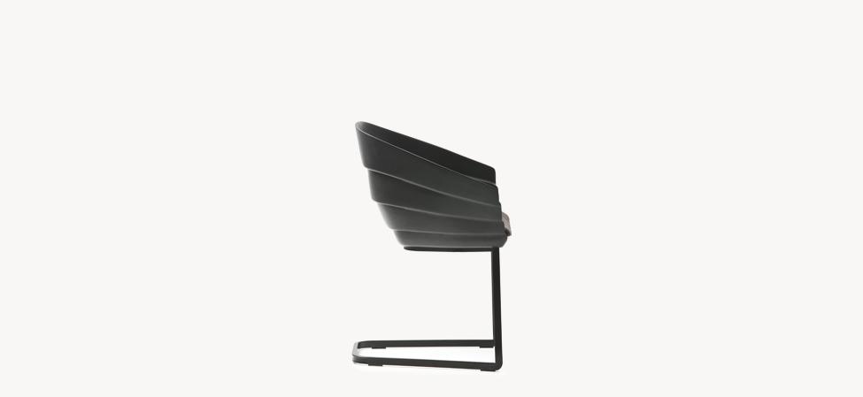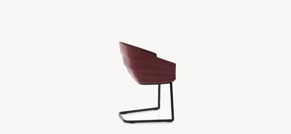 Scocca in poliuretano integrale strutturale e basamento cantilever in acciaio verniciato. La sedia cantilever è impilabile fino a 4 unità.
