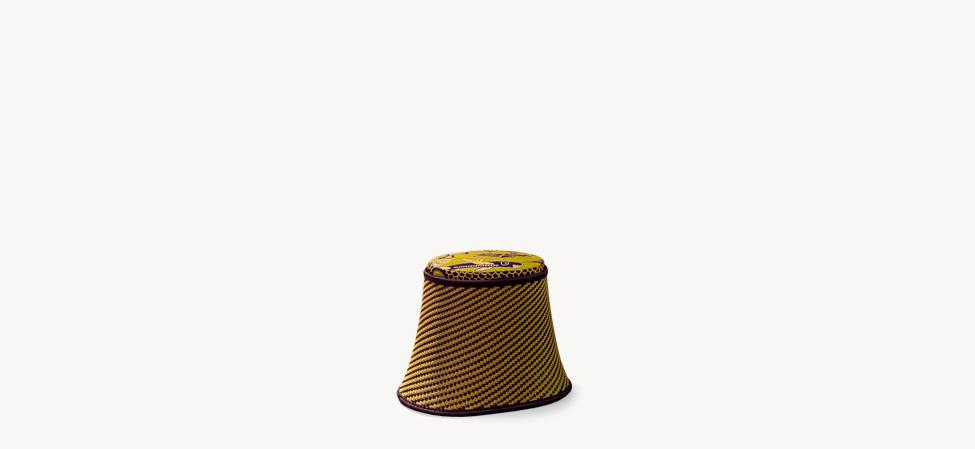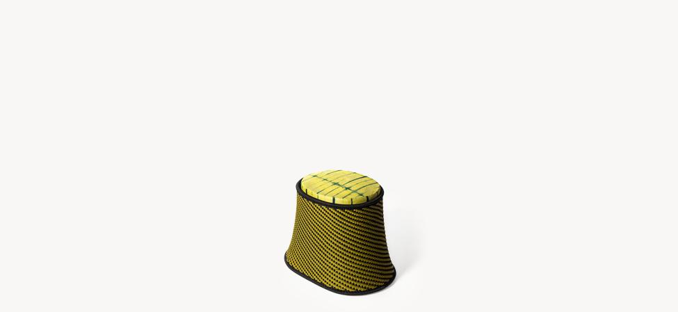 Struttura in acciaio verniciato e fili colorati in polietilene intrecciati a mano. Il pouf è corredato da un cuscino in tessuto stampato. Consigliato per interni solamente.