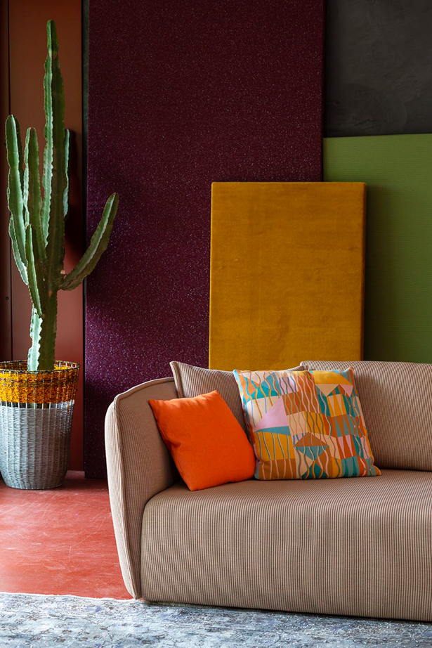 Attraverso cinque moduli, diversi per estensione e profondità, e un solo raccordo è possibile immaginare una molteplicità di combinazioni, dal semplice accostamento speculare alle sequenze geometriche più articolate. Il segno è forte, riconoscibile nei riferimenti alla destrutturazione operata con Lowland (2000) e al sofisticato disegno di Redondo (2010) o di M.a.s.s.a.s (2012). Il termine “chamfer” rimanda al dettaglio architettonico dell’“angolo smussato”. Da qui deriva la forma in pianta del divano, che caratterizza tutti gli elementi del sistema di sedute. Versatili, flessibili, sontuosi, questi divani ci accolgono in un grande ed elegante abbraccio.