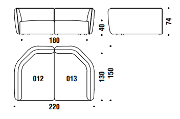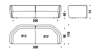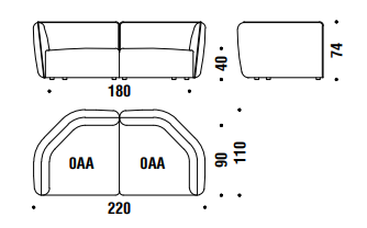 Poliuretano espanso e schiumato a freddo ignifugo indeformabile a densità differenziata e fibra poliestere con struttura interna in legno. Piedi in polipropilene nero. Cuscini opzionali in fibra poliestere e chip di memory foam. Tutti gli elementi vengono forniti completi di dispositivi di unione in ABS. La collezione Chamfer 1 è sfoderabile.