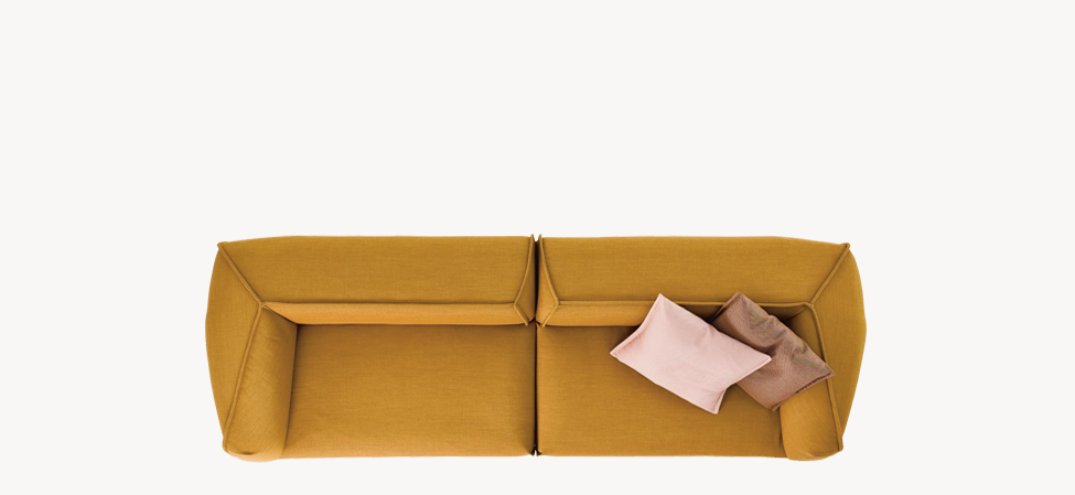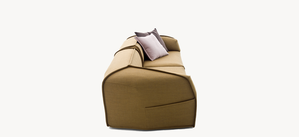 chi smussati dal taglio di una lama immaginaria. L’ordine geometrico è rotto, travolto a favore di un movimento, di un margine che attraversa i perimetri. Le facce rendono evidente la nervatura; alcune cuciture, evidenti come imbastiture, la disegnano, altre scompaiono. L’utilizzo è libero, la superficie morbida. La forma esterna, dal punto di vista dei volumi, appare indipendente dalla struttura e dall’imbottitura interna. Divano, poltrona, poltroncina: un sistema componibile dove ogni elemento mantiene indipendente il carattere, per funzione e presenza scultorea.