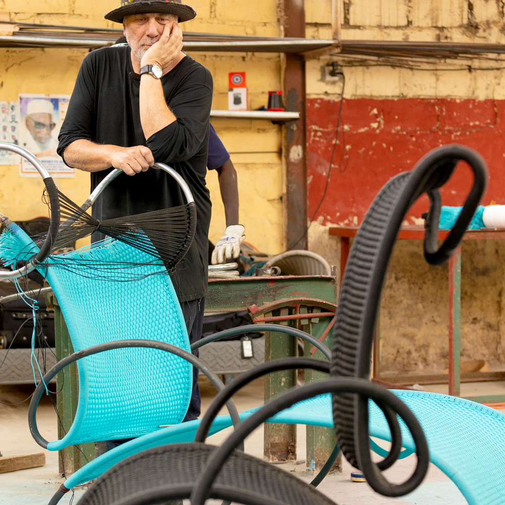 La collezione di sedute è realizzata intrecciando il filo in polietilene utilizzato tradizionalmente in Africa per le reti da pesca. Progetti non-omologati per antonomasia, diversi e originali, lavorati interamente a mano a Dakar, in Senegal, nei laboratori M’Afrique.