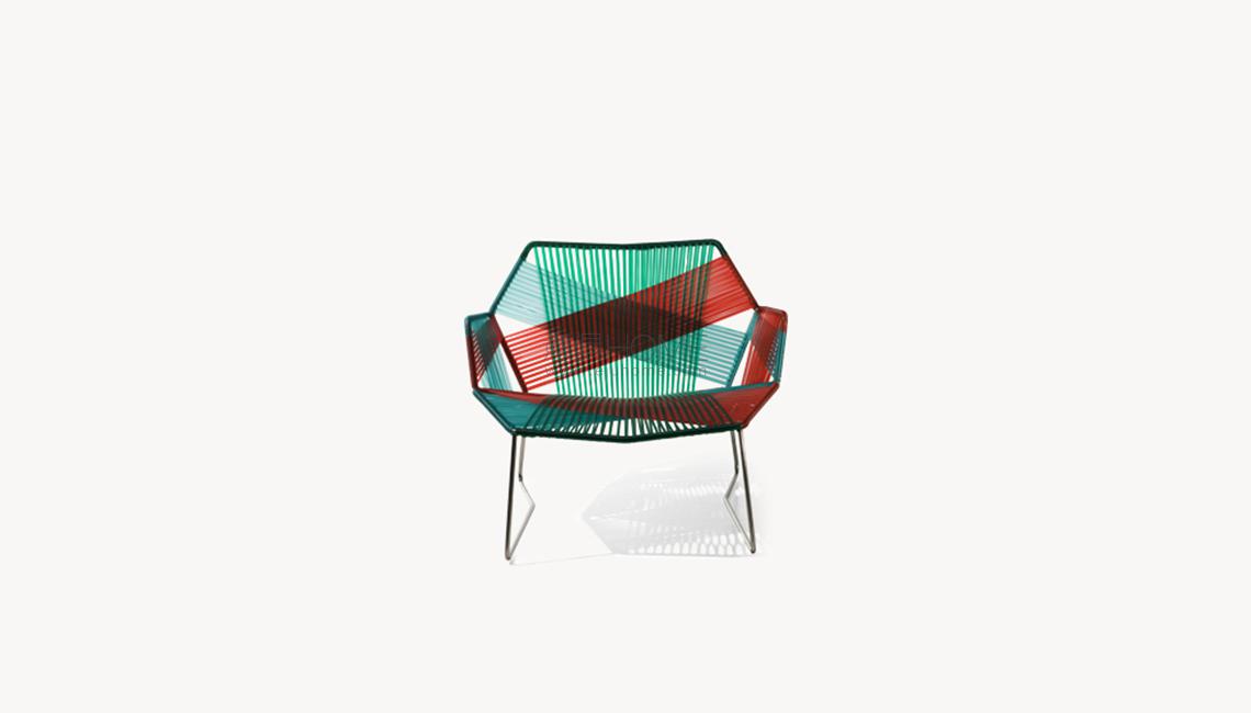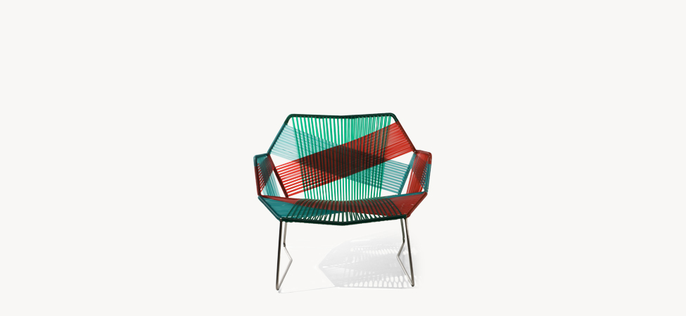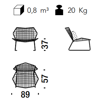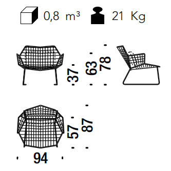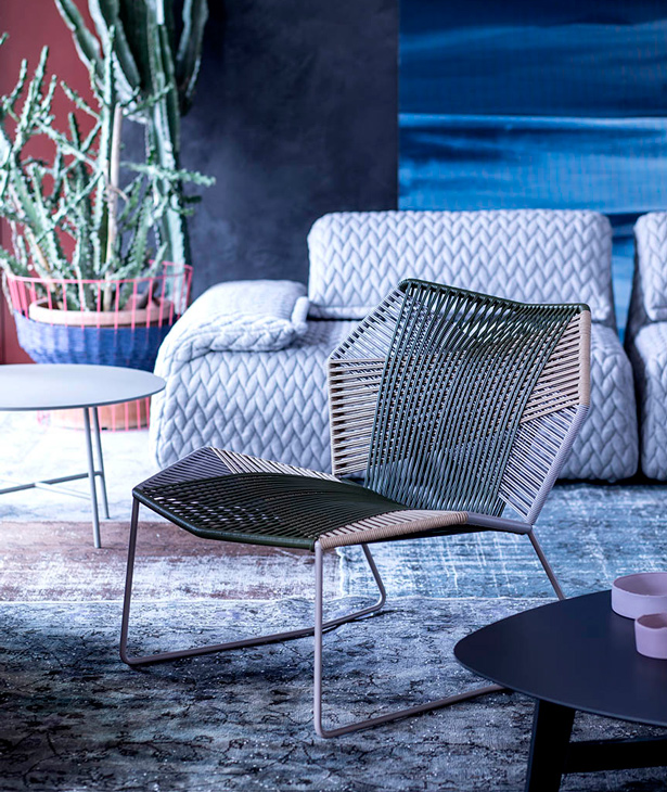 Struttura in acciaio inox o verniciato per uso esterno. Sottopiedi in PVC. Intreccio in filo tecnopolimero.