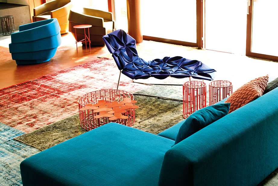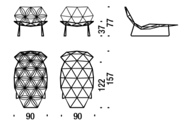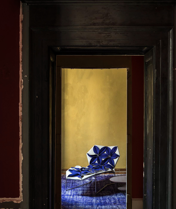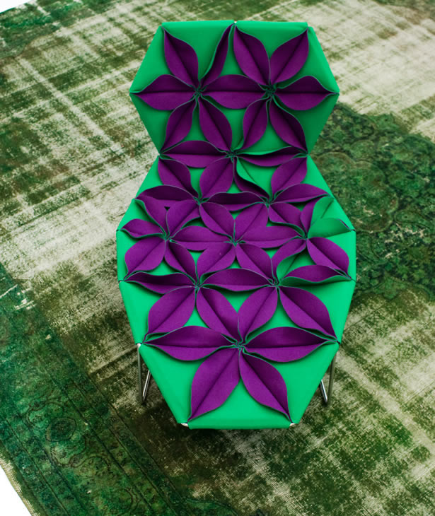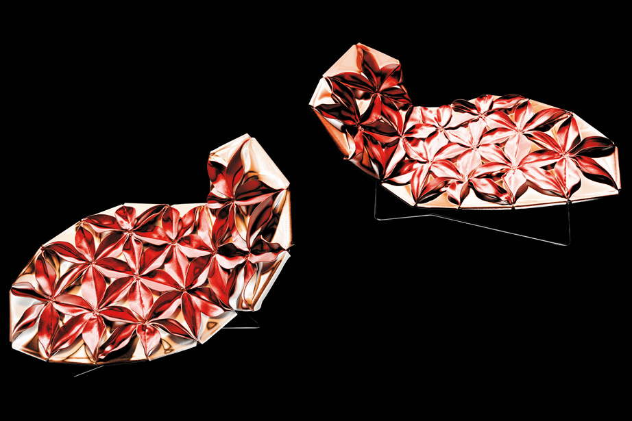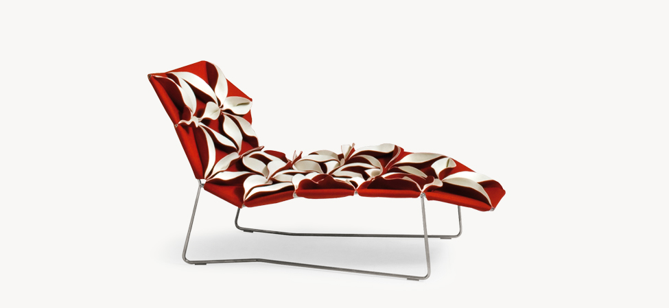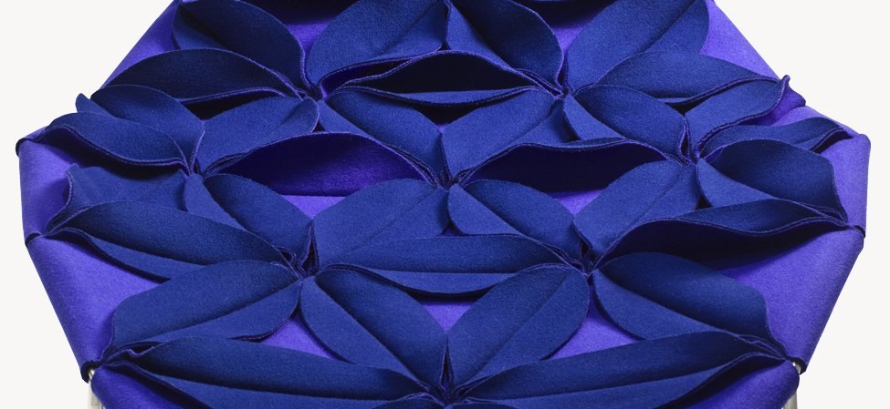 Una forma nuova per una seduta non imbottita, geometria tridimensionale sviluppata partendo dalla genesi cellulare di petali cuciti seguendo l’ordine di una struttura grafica a base triangolare. L’esito è un’esplosione floreale, prodigiosa manifestazione simbolica della fertilità. Antibodi è energia vitale, archetipo di grande e ambivalente fascino. I petali, in materiale doppiato feltro e panno – panno e pelle – danno vita a un rivestimento portante, successivamente fissato al telaio in acciaio inox. Il rivestimento assume una doppia funzione, accogliente, femminile con i petali rivolti verso l’alto, volutamente severa e matelassé con i petali rivolti verso il basso.