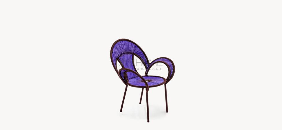 Struttura in acciaio verniciato e fili colorati in polietilene intrecciati a mano. Sottopiedi in PVC.