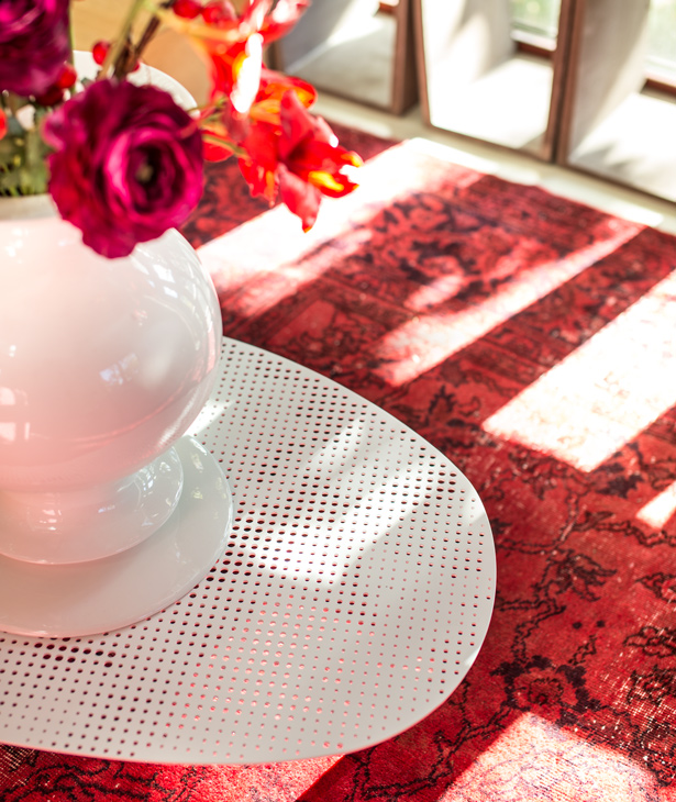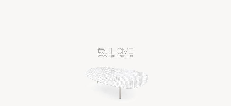 Set di tavolini con piano in acciaio traforato. Verniciatura a polveri e piedi in acciaio verniciato. Sottopiedi in polipropilene.