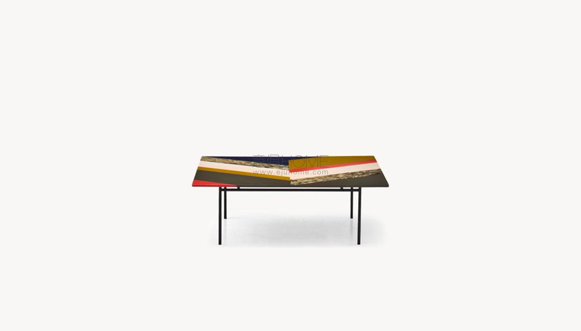 Top in Sintetica? metacrilato colorato e decorato a mano. Tagliato e composto come disegni riportati. Base in acciaio verniciato a polveri nero opaco. Sottopiedi in polipropilene.