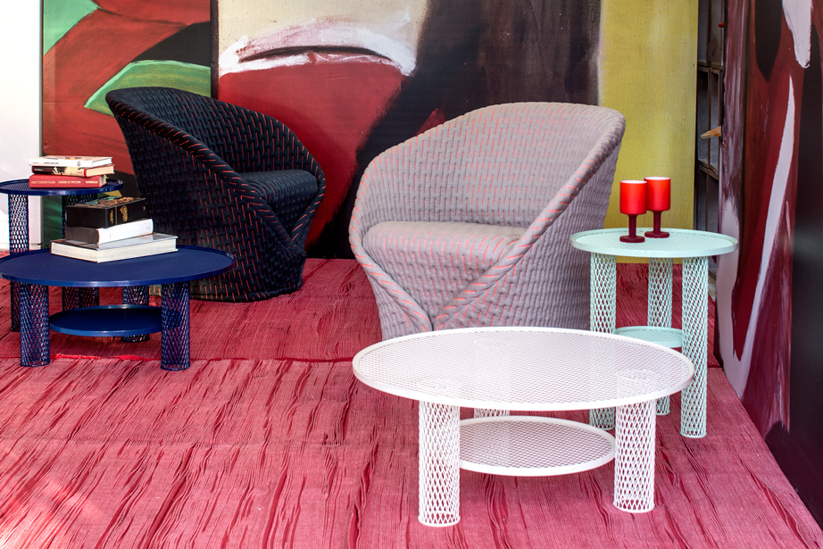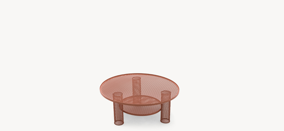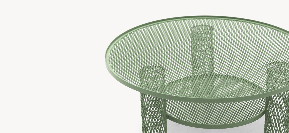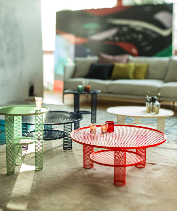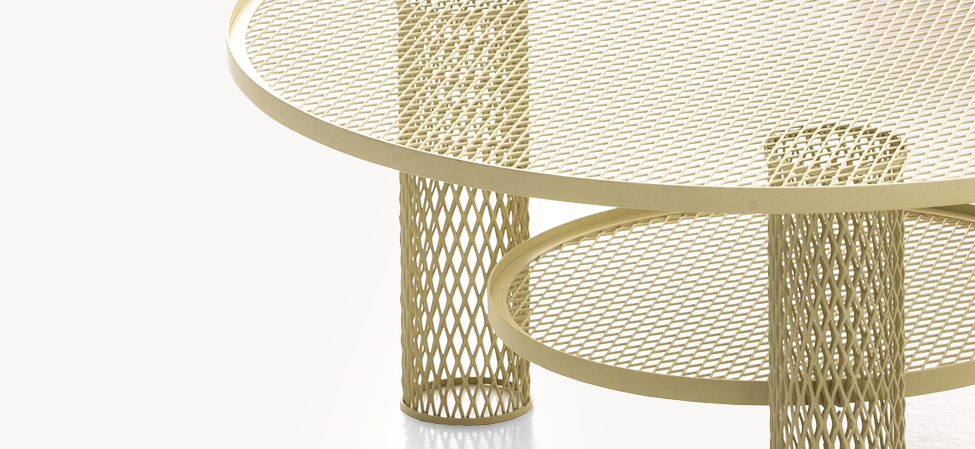 Set di tavolini in rete di acciaio verniciato. I tavolini sono acquistabili singolarmente.