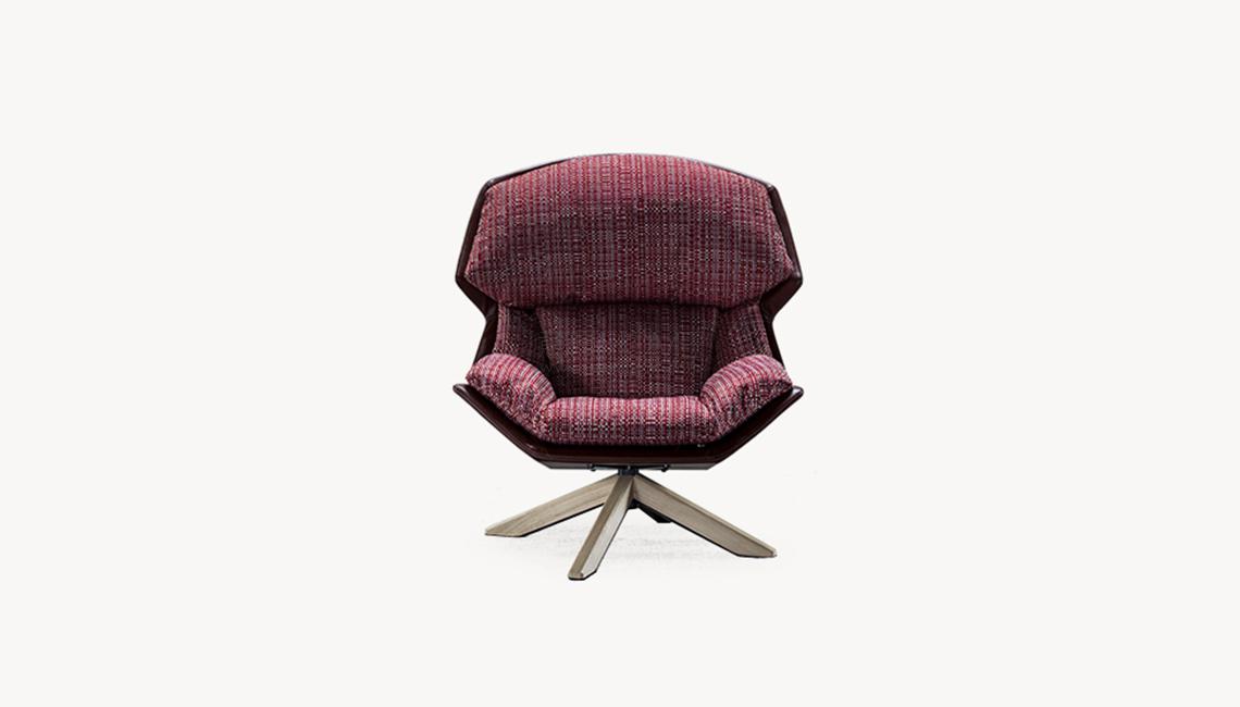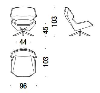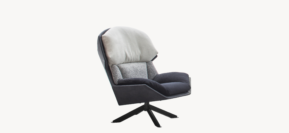 Espanso schiumato a freddo ignifugo con struttura in acciaio. Basamento girevole in acciaio verniciato o con copertura in rovere. La scocca non è sfoderabile, mentre l’imbottitura anteriore è unita alla scocca tramite una zip divisibile.
