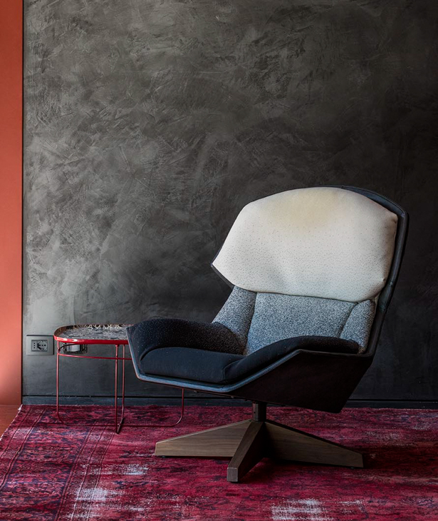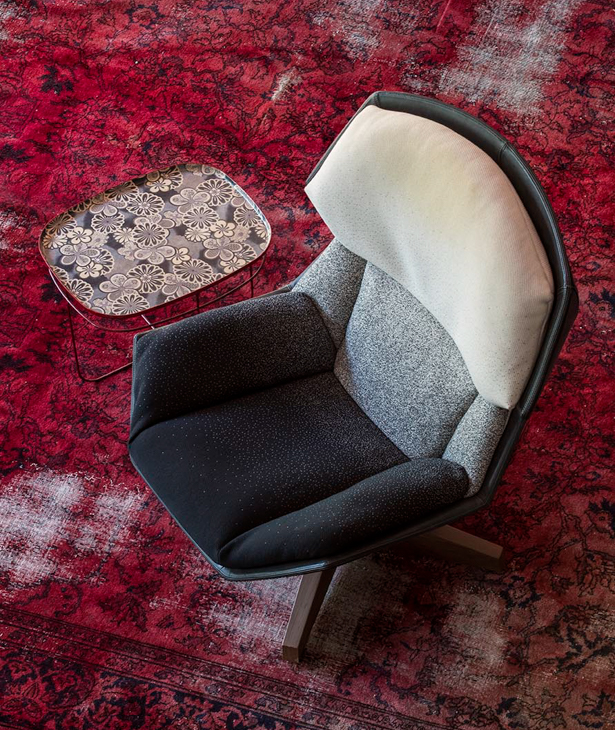 Una seduta e il suo doppio: da un lato contiene e protegge, dall’altro distende e accoglie. Una vistosa ambivalenza che separa artificiosamente forma e contenuto, immagine e concetto, che non a caso suggerisce con il nome – hood, cappuccio – una doppia funzione. Il cappuccio è un simbolo antico e contemporaneamente urbano; protegge e incornicia il viso ma può nascondere, negare il dialogo e il confronto. L’impatto è forte, tutto giocato sul filo del contrasto: le tre dimensioni sembrano recitare la geometria bidimensionale del disegno, la sovrapposizione cromatica non divide ma complementa, la tensione non viene sopita ma stabilizzata. Clarissa è poltrona relax dinamica, pronta allo scatto ma disposta al riposo, alla sospensione temporanea delle attività. Una combinazione di agonismo e collaborazione, di provocazione ed estetica.