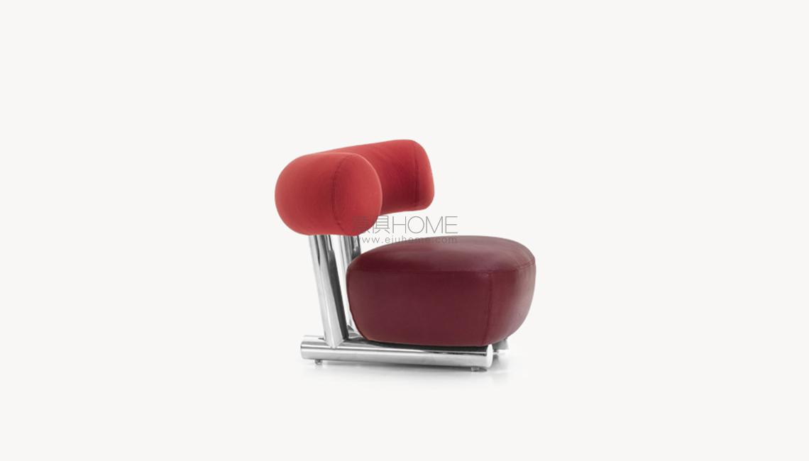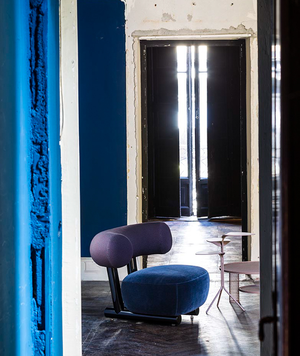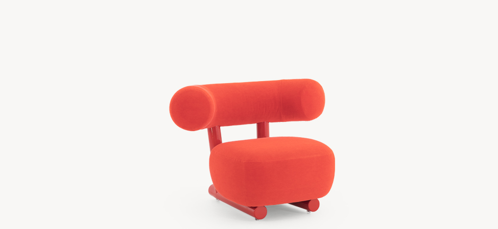 Anteporre il grosso al fino, prediligendo una scelta in controtendenza rispetto alla più comune ricerca sulla forma sottile. E, nonostante questo, mantenersi leggeri, lievi. Il progetto si articola così attorno all’aspetto più rassicurante dell’oversize: la semplicità. La struttura, essenziale e robusta, è costruita con un tubo in alluminio verniciato a polvere dal diametro di 80 mm. Appoggiato sopra, un cuscino di seduta dalla corporatura rotondeggiante, velata suggestione all’idea del modulo gonfiabile. Lo schienale, come una parentesi bold, promette comodità. L’effetto, oltre alla naturale simpatia, è quello di una piacevole rotondità, disinvolta e leggera.