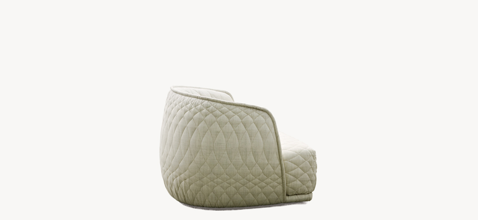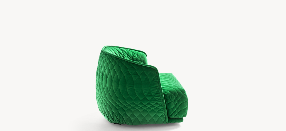 Una collezione caratterizzata dall’accostamento di due volumi, una scocca imbottita che avvolge in continuità i grandi cuscini di seduta. Forme curve esaltate dall’assenza totale di spigoli e dalla morbidezza del tessuto, stimolo sensoriale impreziosito da un decoro trapuntato dove il filo, come una matita, segna un’elegante geometria tridimensionale. Redondo, nel disegno, si ispira agli interni imbottiti delle auto americane degli anni ’50 e ’60, alle forme morbide della carrozzeria, al comfort on-the-road che accompagnava nei lunghi viaggi tra le East e la West Coast. Il punto di vista è, per chi guarda, quello di un palcoscenico dove accadono piccole storie quotidiane.