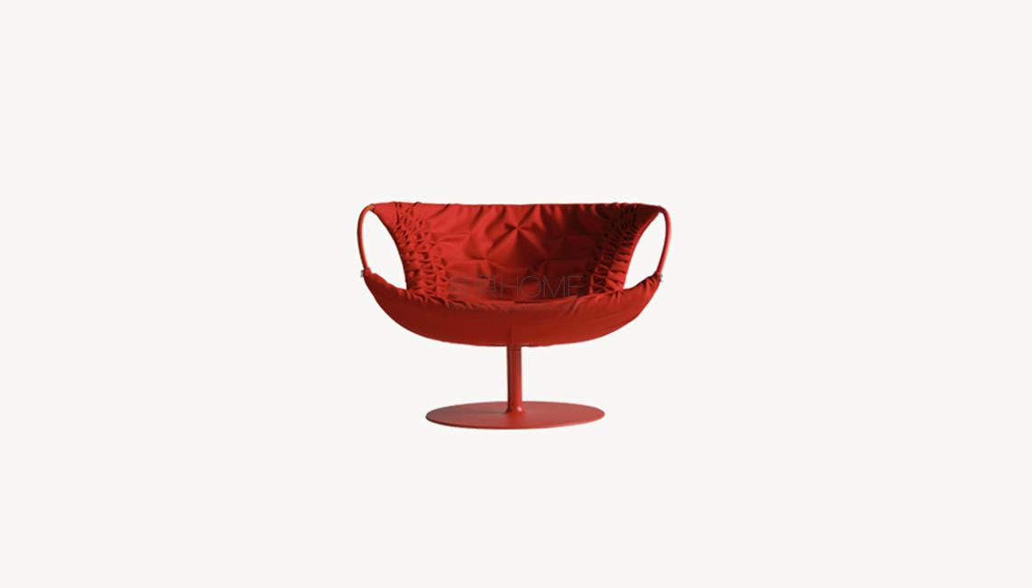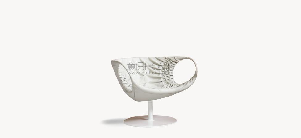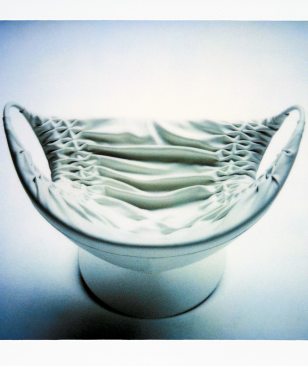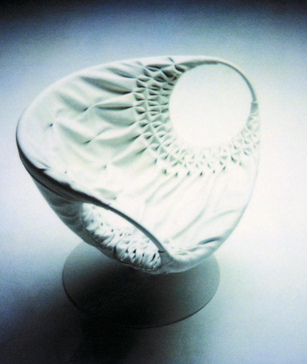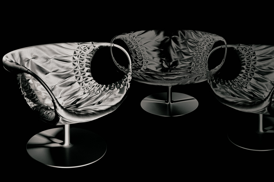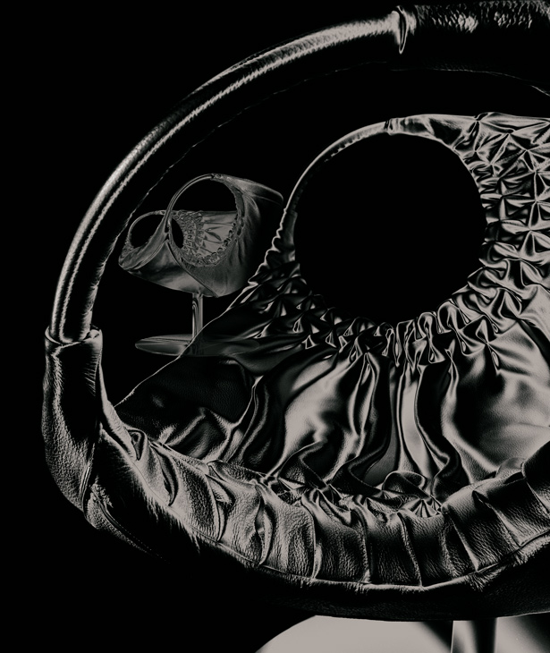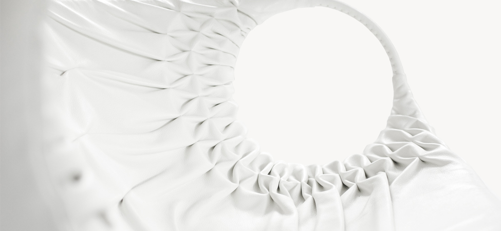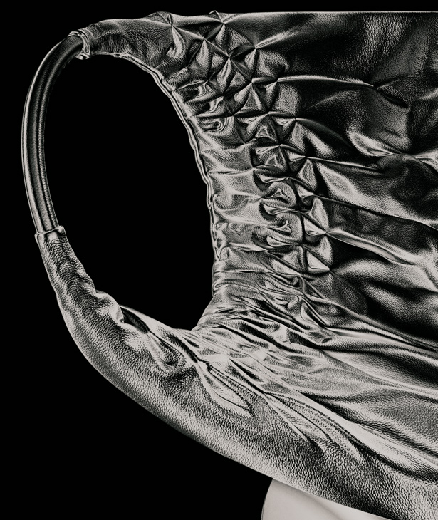 Scegliere un punto di ricamo, un’estetica classica e decontestualizzarla. Fondere artigianalità e processo industriale e dilatare l’immaginario, generando una figura sofisticata ed elegante capace di penetrare l’universo simbolico femminile. E di ampliarlo. Due anelli diventano braccioli, ricordando nella purezza dell’esecuzione stilistica una bamboo bag; il guscio, simile per certi versi ai grandi guanti di pelle utilizzati dai giocatori di baseball, è un gilet aperto, pronto per essere indossato, un’alcova intima e accogliente. I ricami laterali – a punto smock – rendono il drappeggio contemporaneo per stile, leggero nella forma, infondendo all’oggetto di seduta la grazia e la raffinatezza proprie di un accessorio personale.