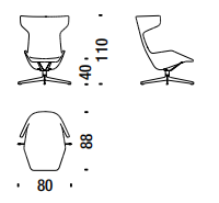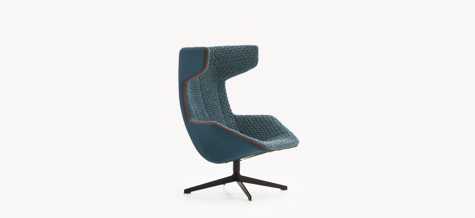 Espanso schiumato a freddo ignifugo con struttura in acciaio. Basamento a 4 punte verniciato girevole (cod. 0V6, 389). La poltrona è disponibile con trapunta imbottita (cod. 340) o con tessuto trapuntato (cod. 354). La collezione Take a line for a walk non è sfoderabile.
