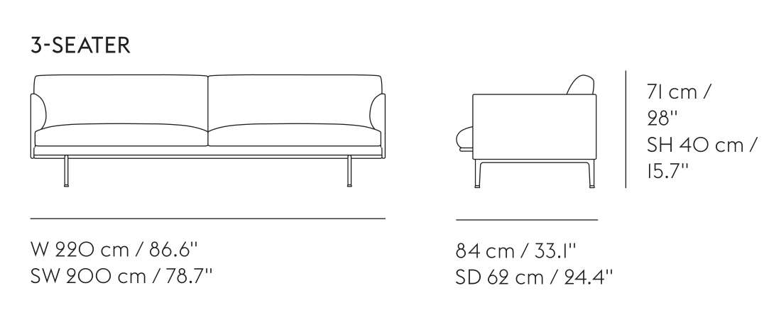 The Outline Sofa adds new perspectives to the classic Scandinavian design sofas of the 1960's, marrying the ideals of simplicity and function into one. With the design taking its name from its strong outline of a sofa, the Outline Series is clean and elegant on the outside with a deep seat and soft cushioning on its inside. The Outline Series has an expression that is at once elegant yet timeless, elevated by its lines referencing architectural shapes alongside its curved armrests, giving the design a distinct appearance across various sizes and variants. The Outline Series also includes Studio versions of the Sofa and Chair, being compact versions with slimmed-down proportions for smaller spaces within the home, hotel rooms, work settings and more. The Outline Studio Sofa and Chair have a smaller depth of 76 cm / 29.9”.