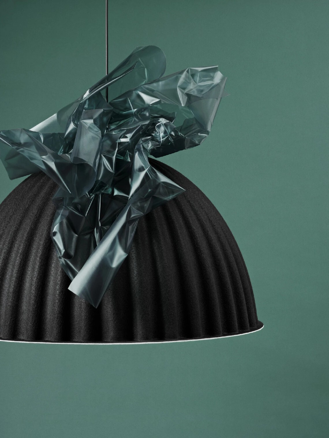 Designed in a material that uses up to 41% fibers from recycled plastic bottles, the Under The Bell Pendant Lamp not only brings a tactile and modern expression to any space but also impacts the acoustics of a room through its soft shade, paired with its graphic lines and subtle color palette.