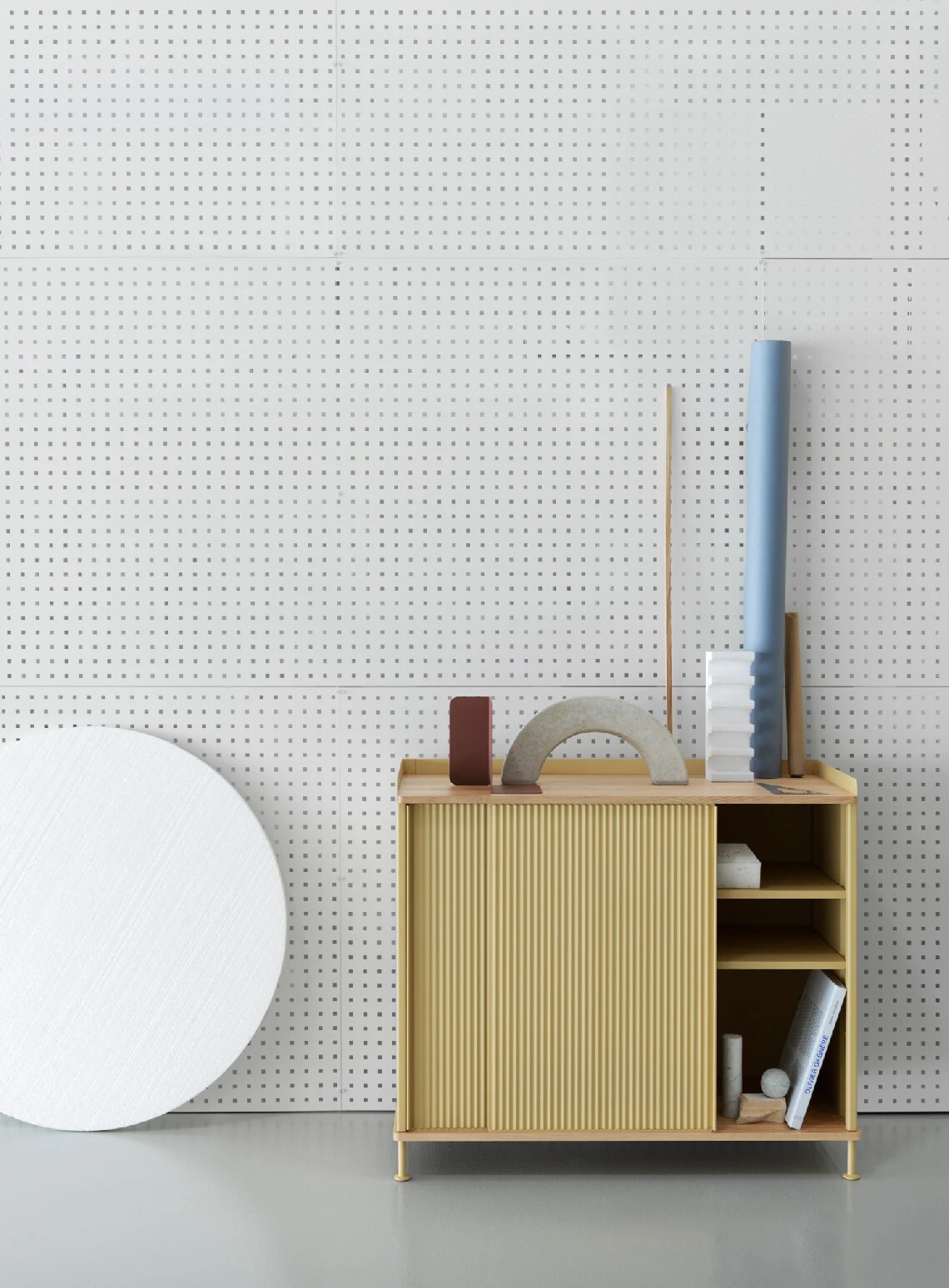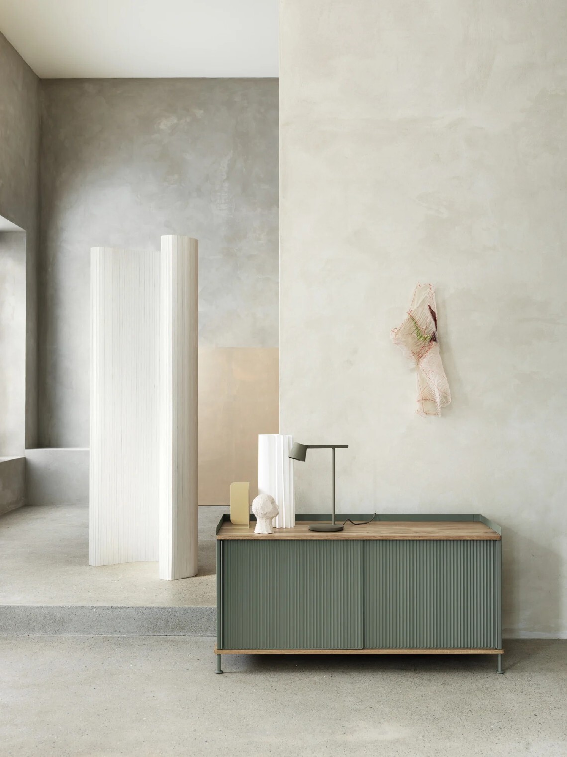 The Enfold Sideboard combines industrial materiality with residential references for a new perspective on modern storage. Made from a lacquered steel that gently enfolds its top and bottom in solid oak, the Enfold Sideboard fuses cold and warm materials for a unique expression, paired with the vibrantly modern expression of its ridged steel doors. The design comes in two sizes: one vertical and one horizontal, both with adjustable shelves to either side of its middle—the horizontal sideboard has one shelf to either side of its middle to be placed across five different levels while the vertical sideboard has one shelf to either side of its middle to be placed across three different levels. Both sizes have outlets for cables inside.