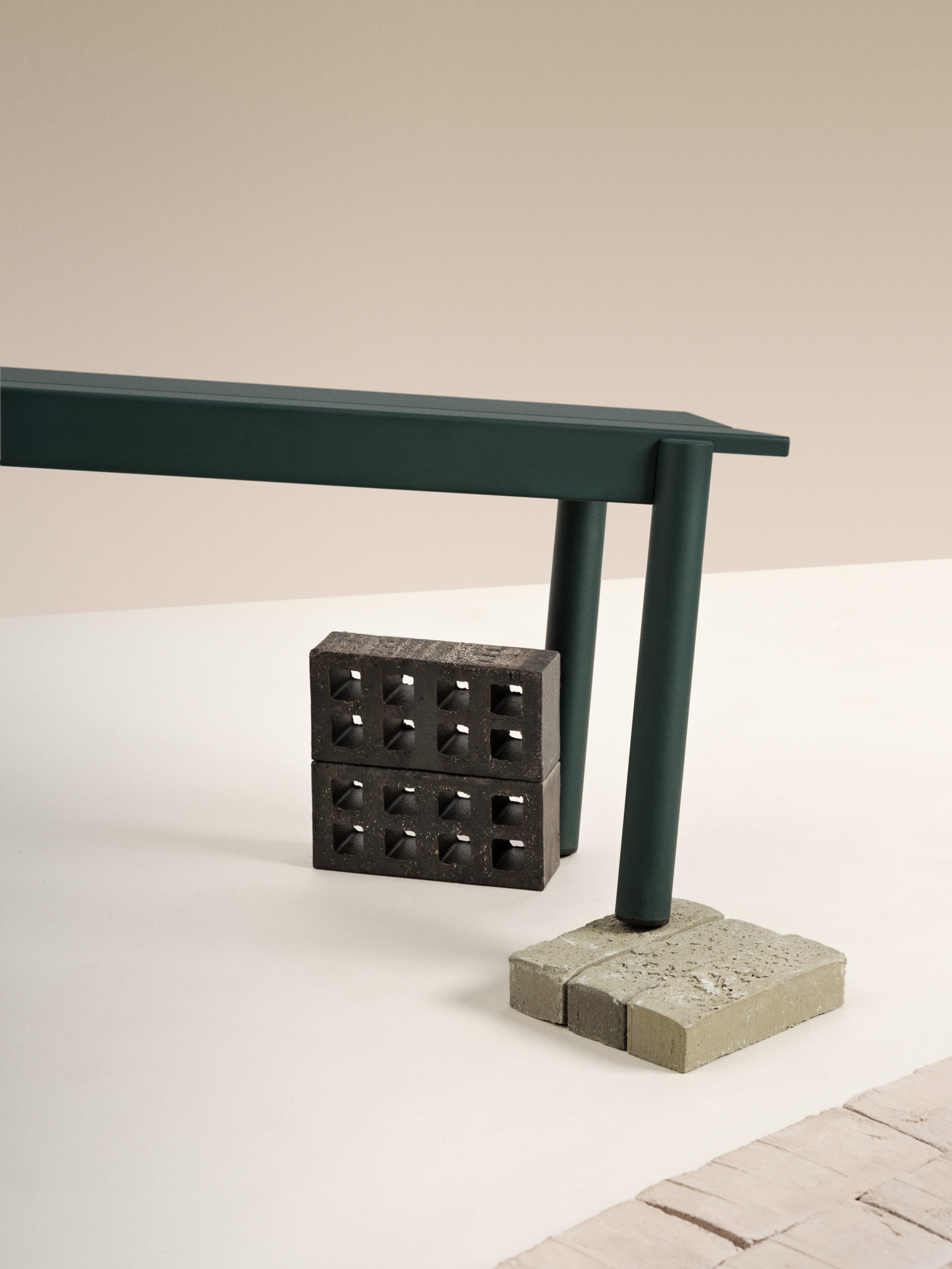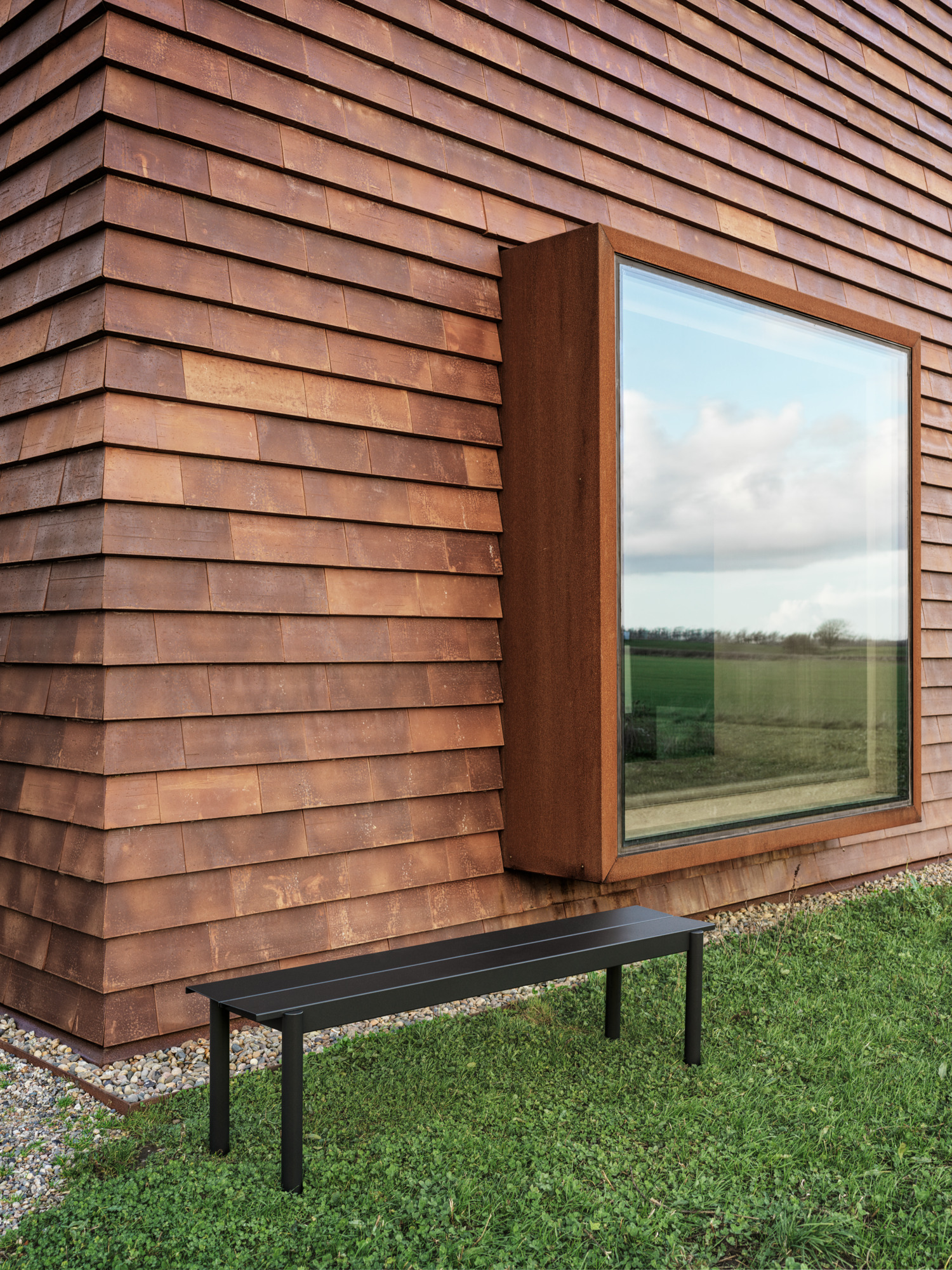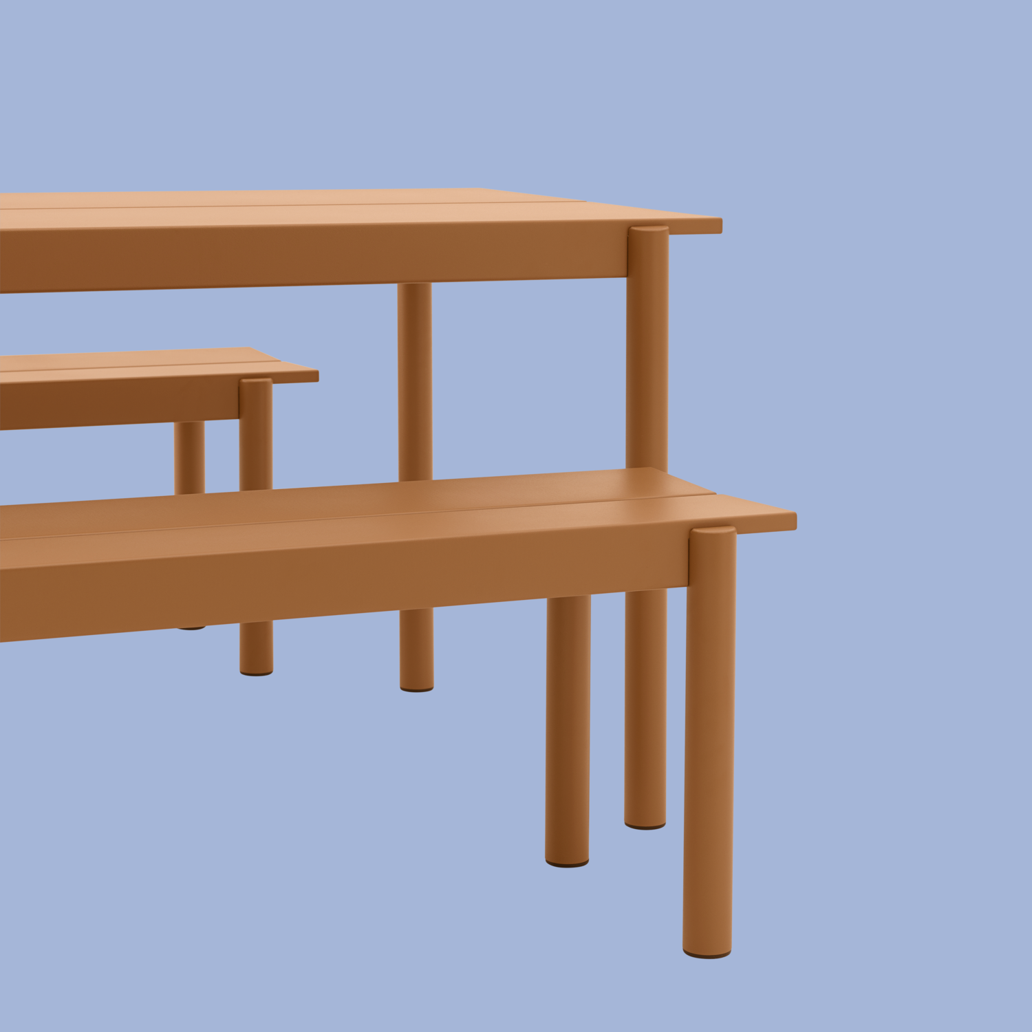 The Linear Steel Bench brings new perspectives to modern outdoor furniture through its straight lines alongside the folded edges, halfcircular intersecting legs and small spacing for easy removal of water. Kept visually clean for long-lasting aesthetics, the Linear Steel Bench finds its distinct character through subtle detailing and a simple expression, allowing for it to complement any outdoor setting. The Linear Steel Bench is designed in proportions that allow for it to slide easily under the matching Linear Steel Table.