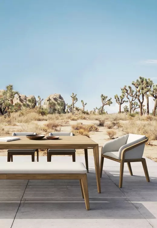 Clean lines and strong curves give Sunrise an undeniably compelling posture, while the warmth of its materials and openness of its frame form an irresistible invitation for endless moments of outdoor enjoyment. Available in warm brushed teak and bold teak scuro, Sunrise includes a complete range of both lounge and dining furniture. Dark teak details and a backrest upholstered in fabric or batyline? complete the design of this robust yet elegant teak collection by Matthew Townsend. From countryside residence to avant-garde hotel or even a futuristic yacht, Sunrise’s versatility makes it a captivating addition to any environment.