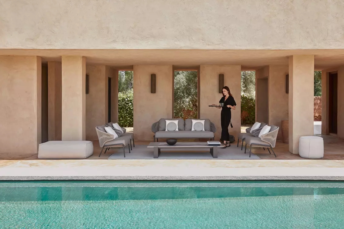 The unique, airy design of the Radoc chair, footstool, lounge chair and sofa collection is perfect for exquisite moments of warmth and closeness. The wrap-around back and armrests, made entirely out of rope, blend seamlessly and give each piece a neomodern yet timeless look and feel. Keep it sober or opt for matching backrest cushions designed for optimal seating comfort for long get-togethers.
