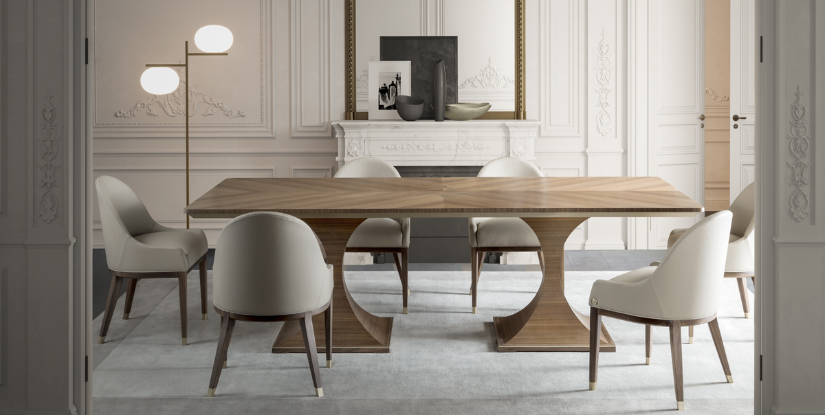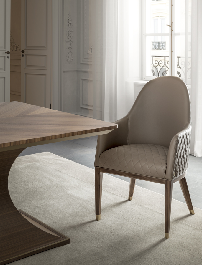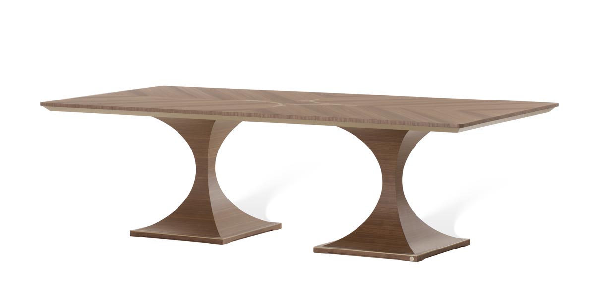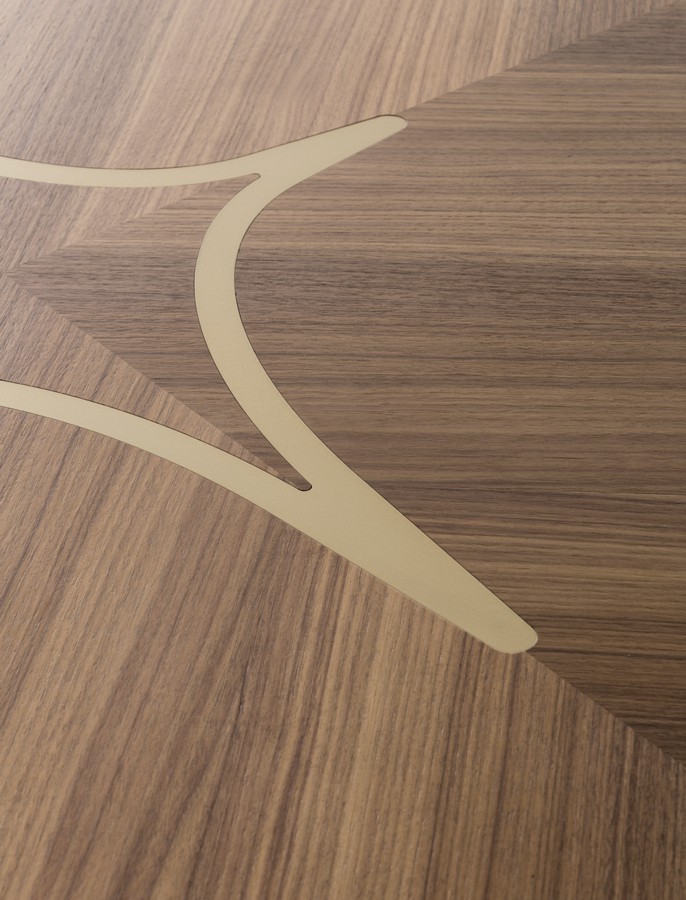 Tavolo in legno. Top in legno con intarsio e dettagli in metallo laccato color oro satinato.