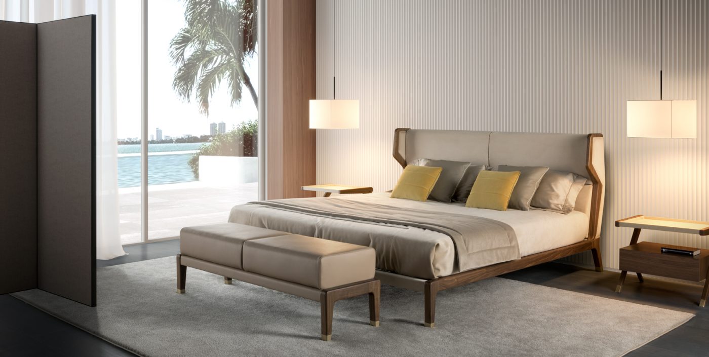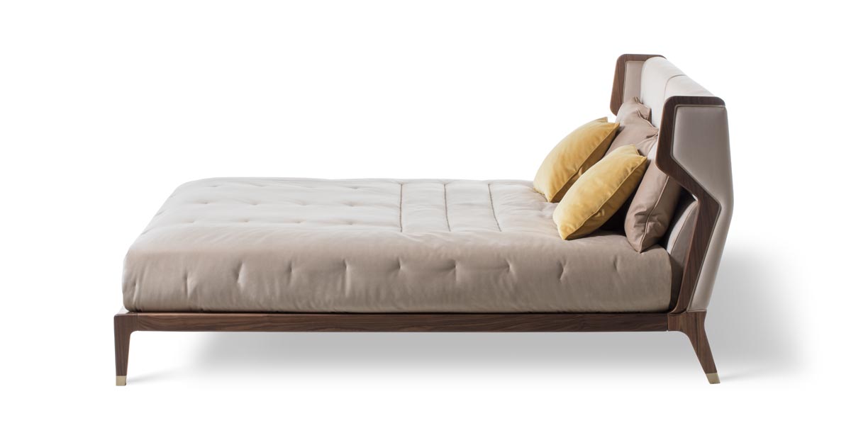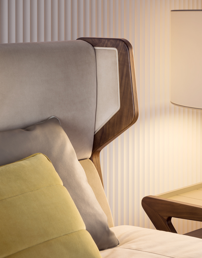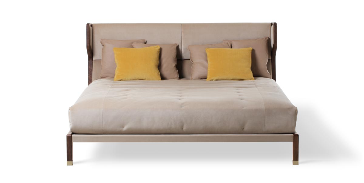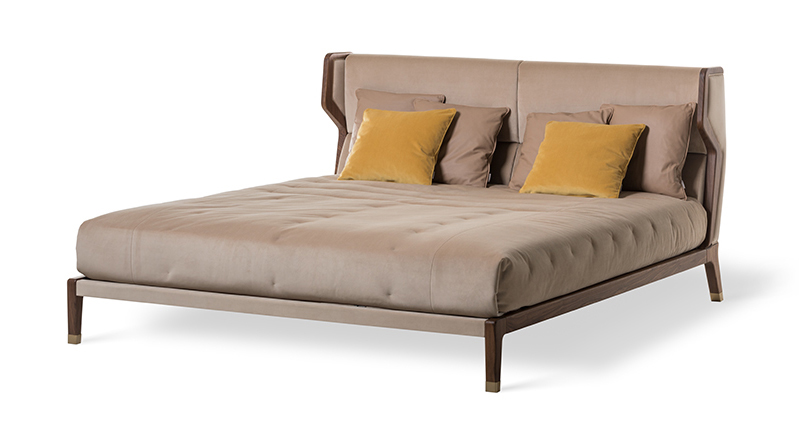 Bed structure in wood and upholstered headboard covered with fabric or leather.