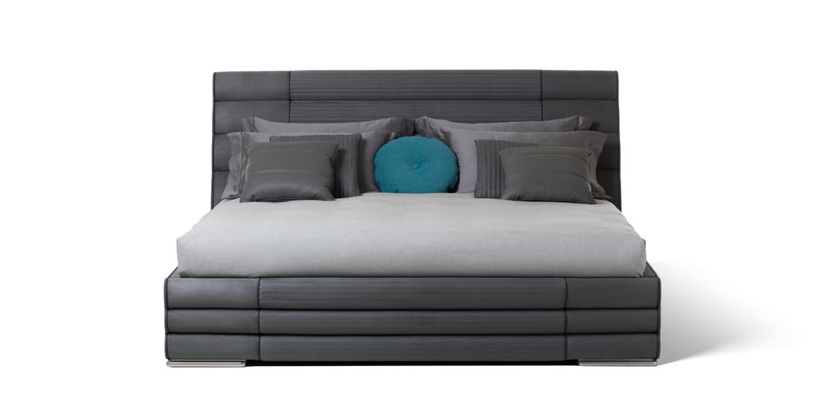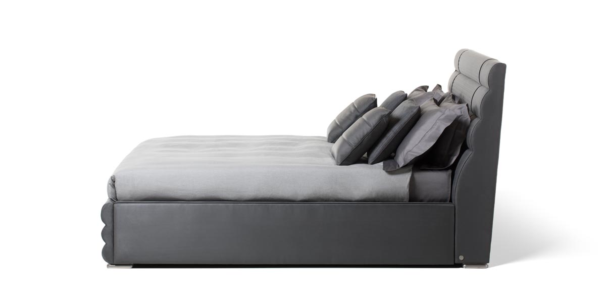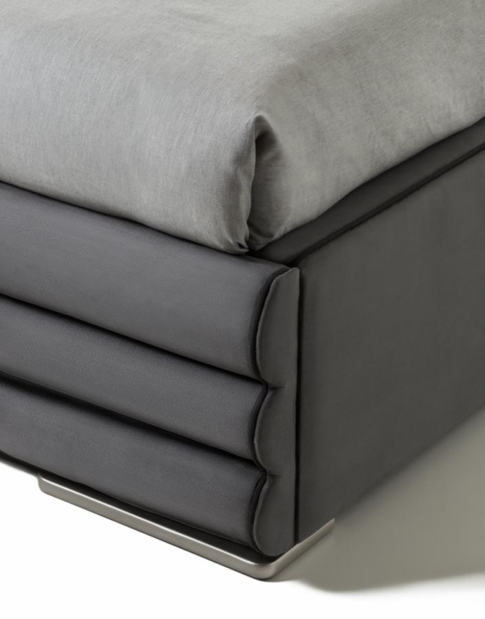 Letto imbottito con piedi laccato color argento satinato. Rivestimento tessuto o pelle.