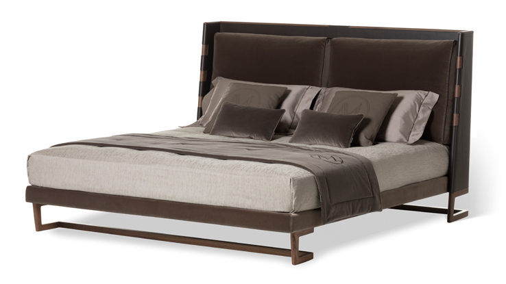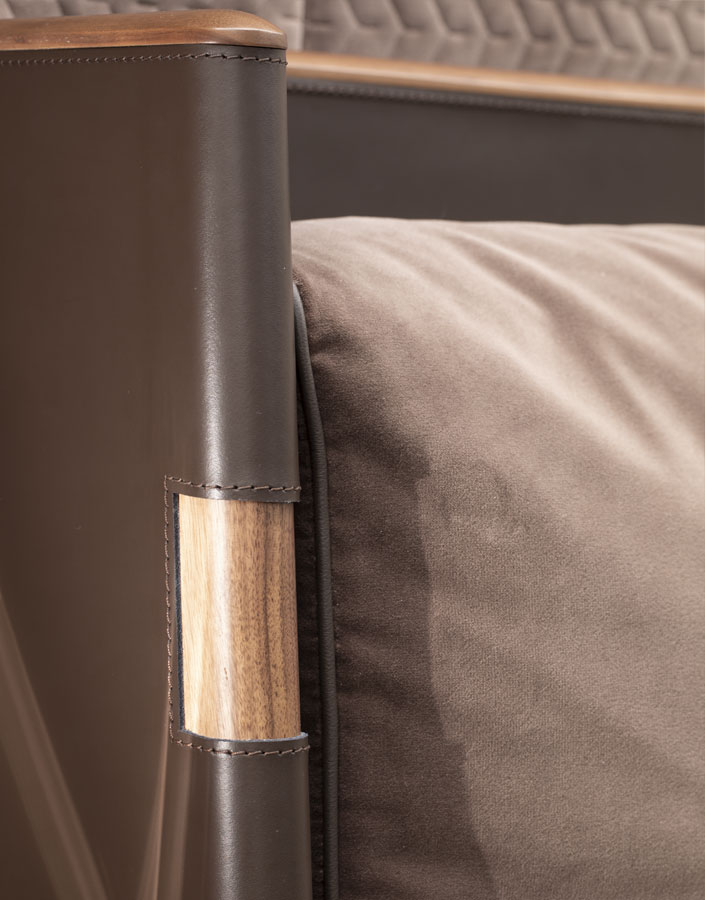 Letto con struttura in legno e inserti in cuoio. Rivestimento tessuto o pelle.