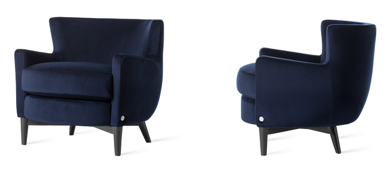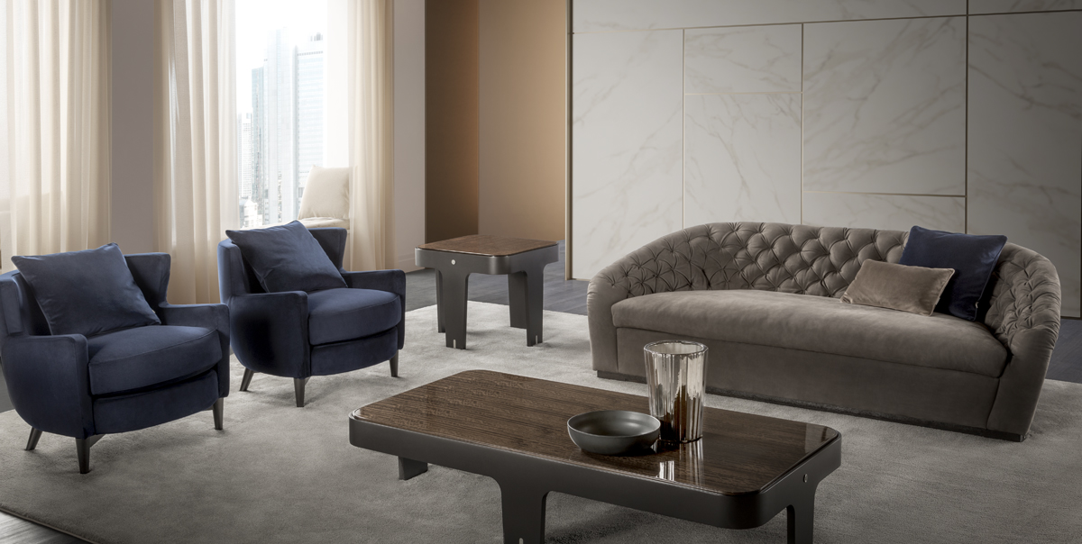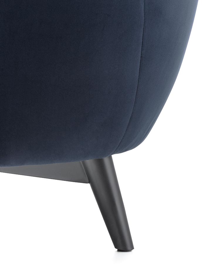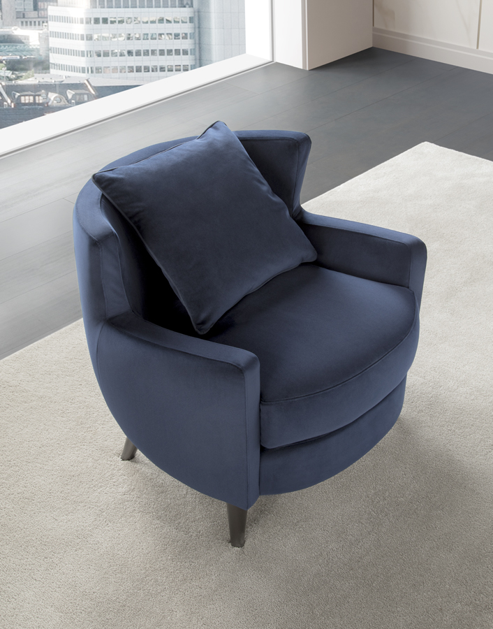 Poltrona imbottita con rivestimento tessuto o pelle.