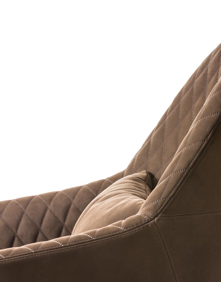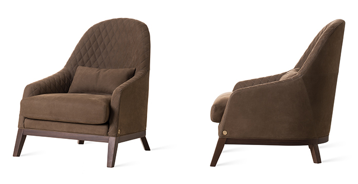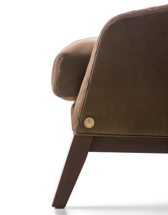Poltrona con struttura in legno. Rivestimento in tessuto e pelle.
