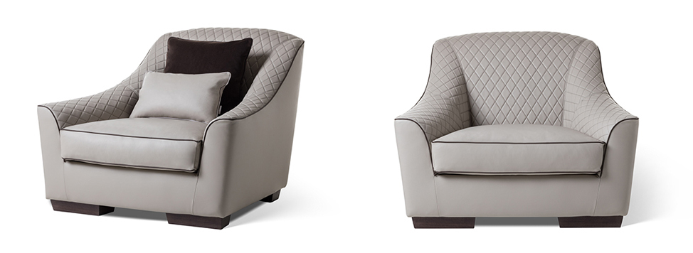 Poltrona con struttura in legno e rivestimento tessuto o pelle. Piedini in legno.