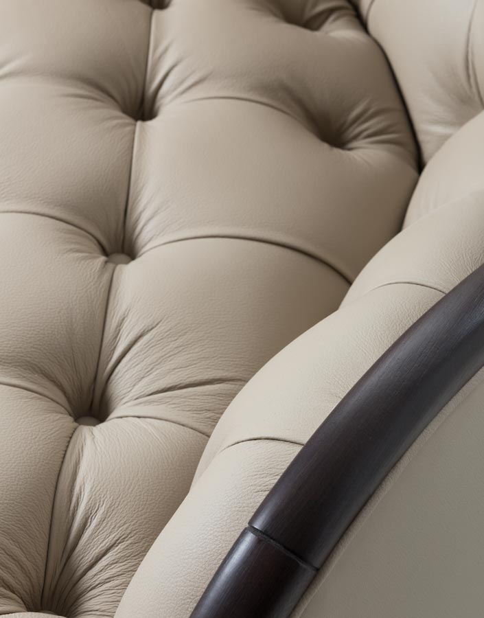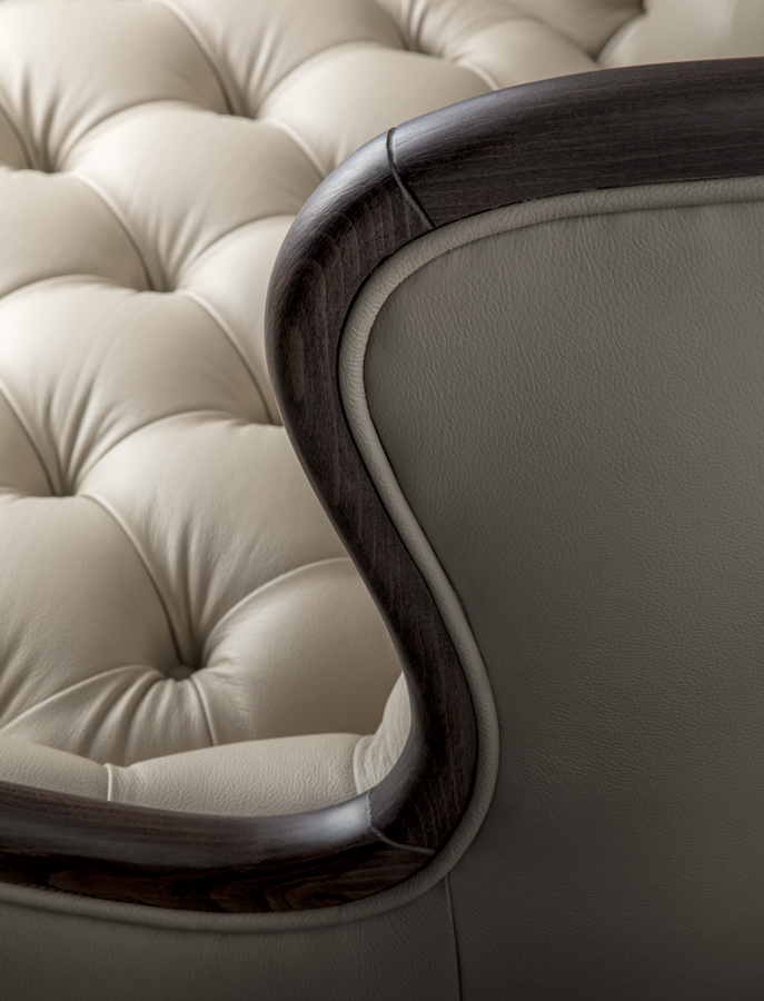 Armchair with wooden structure and capitonè. Upholstery in fabric or leather.