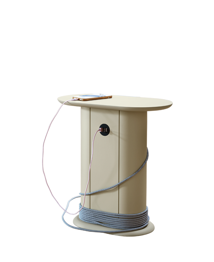 Bobino is a digital native, born with two USB ports on its central column. The power cord forming a coil around the base reveals however that it does not scorn the age of the table top telephone.