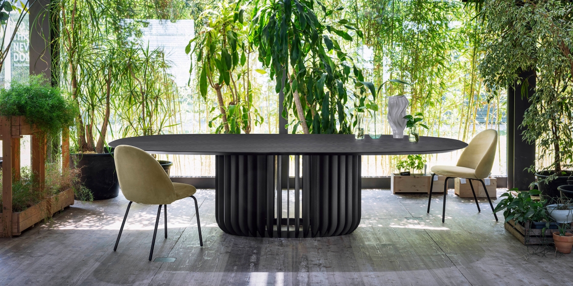 Juice is a monumental table with a meditative air. Its essence lies in the base, where the long wooden legs attach to a ring, encircling it. Juice, a table developed around the balance between filled and empty spaces, creates a sensation of perfect calmness.