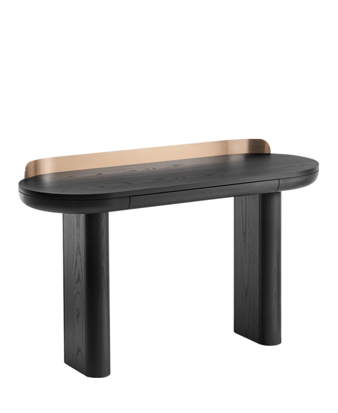 Jumbo is a solid looking writing desk designed to meet the challenges of the home office or limited space of bedrooms. A band of metal embraces the top, embellishing its volume. Jumbo also features a small drawer to please treasure hoarders.