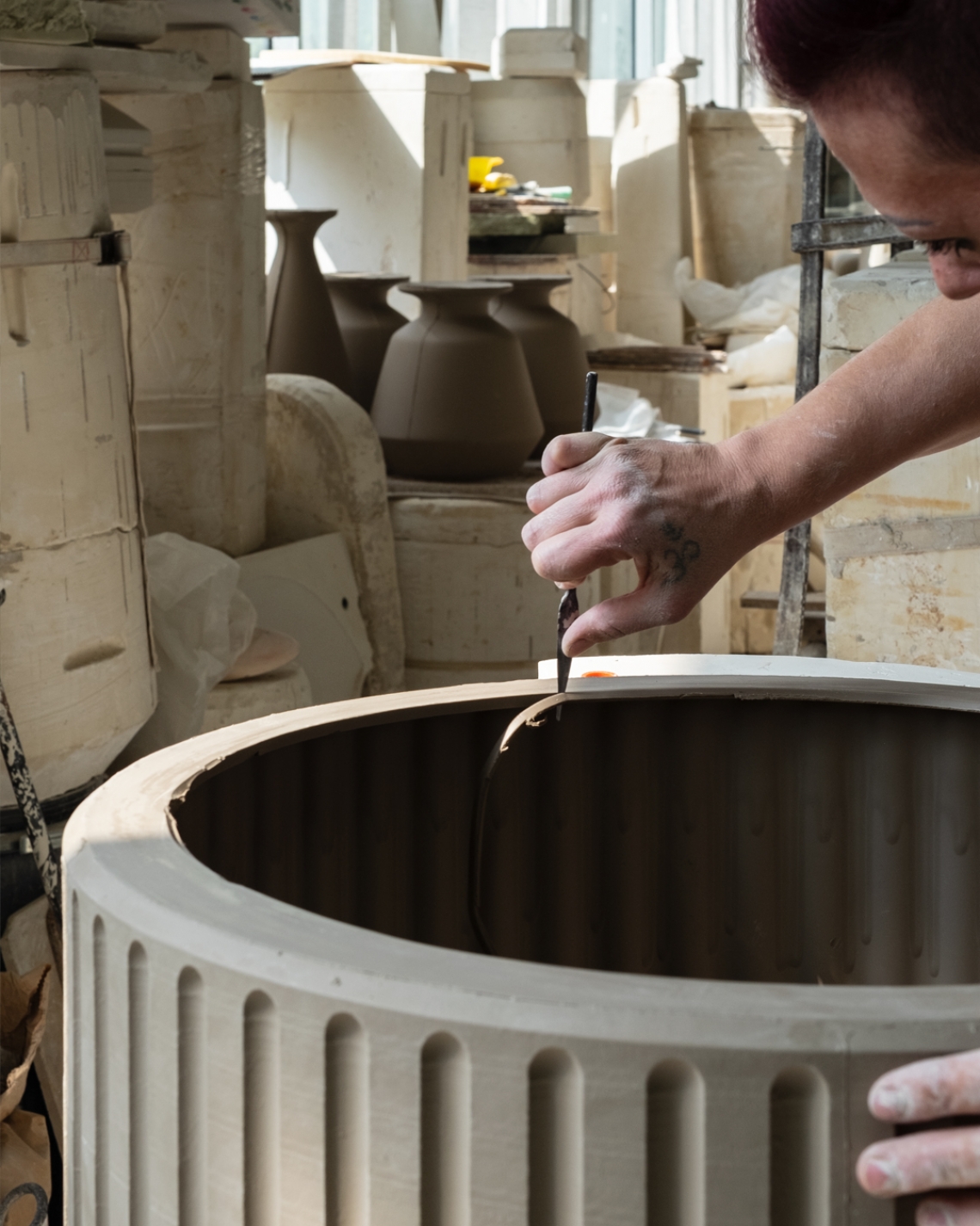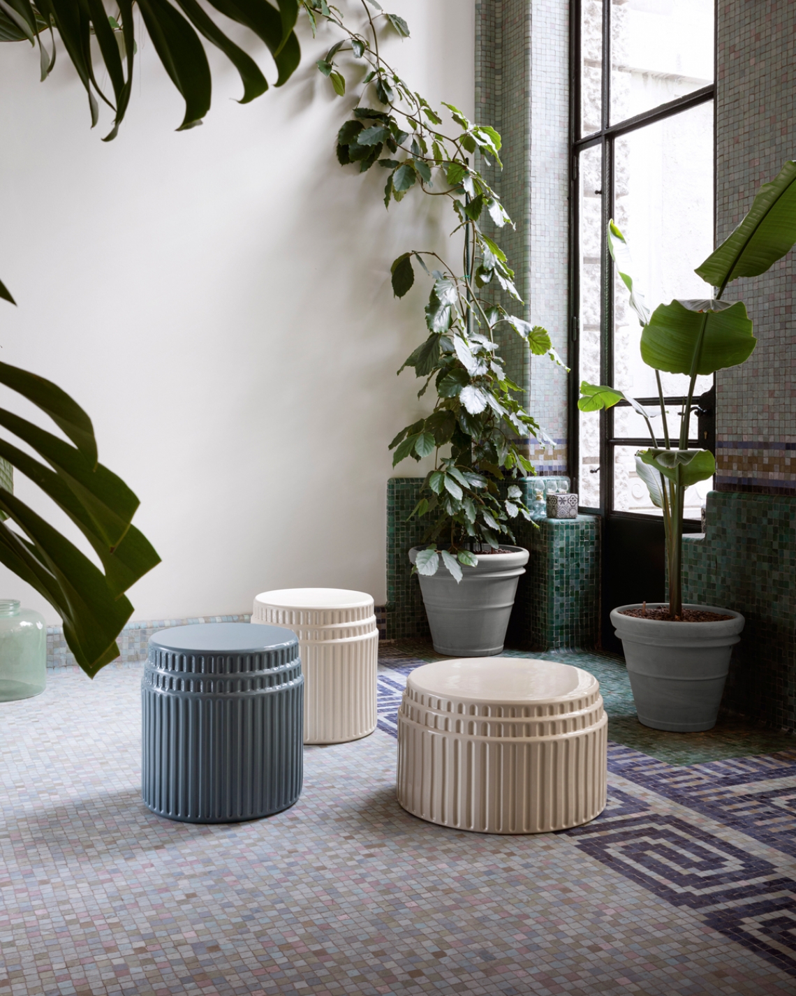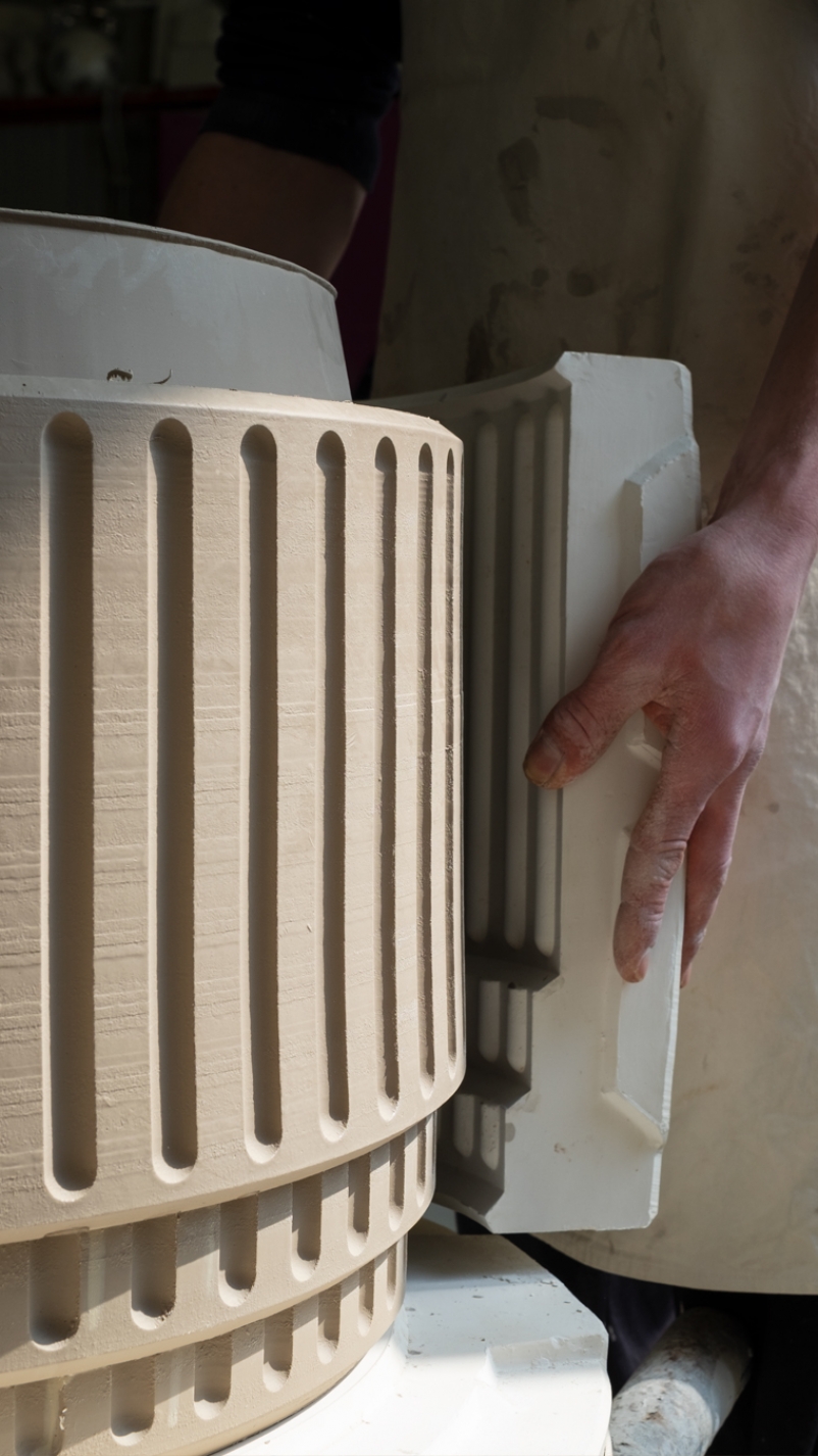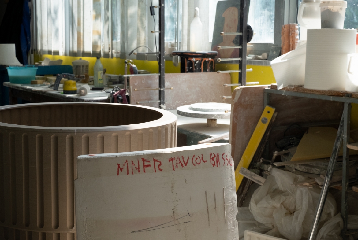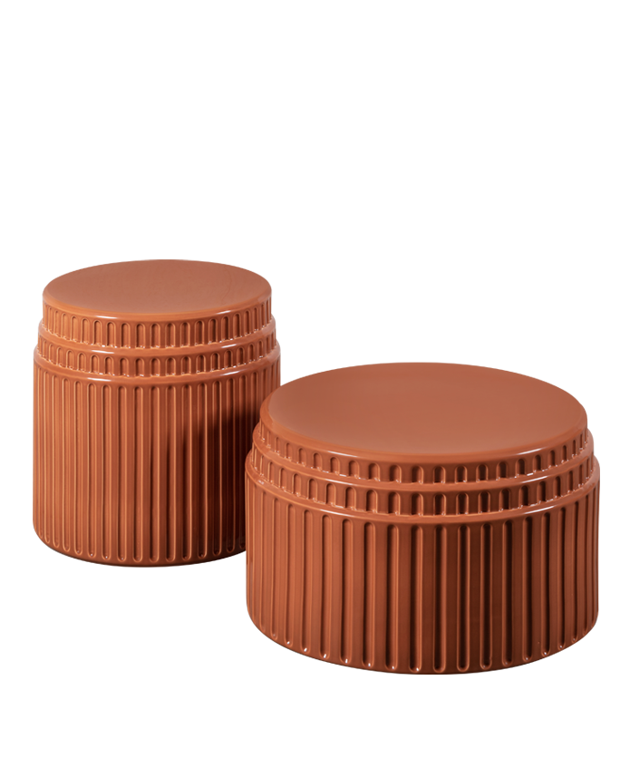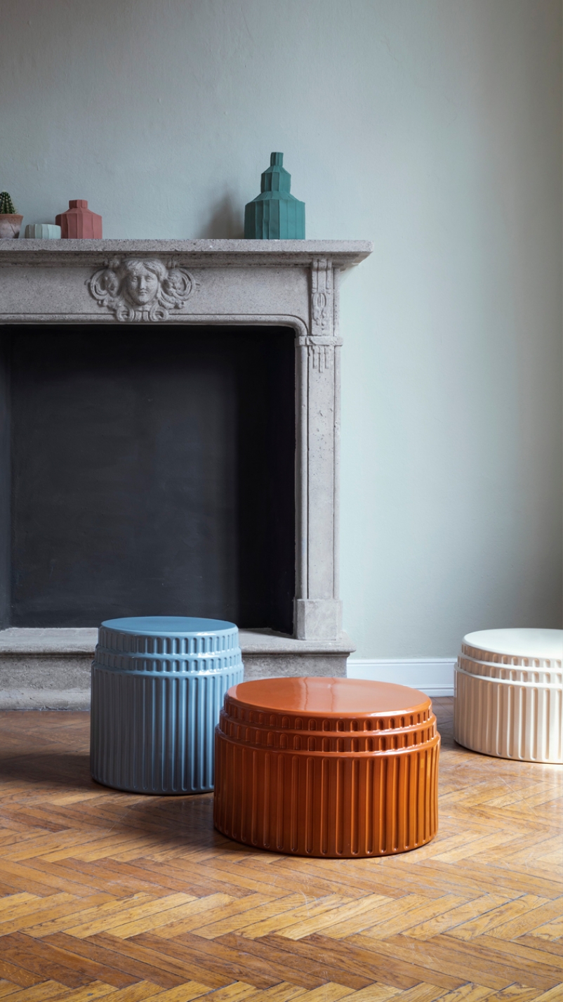 Kolos is formed in a plaster mould in a pottery where craftsmen apply the glaze and then fire the table. Although shiny and polished to the touch, the material it is made of is evident. The corners absorb less colour and become paler while the pigments are concentrated in the rounded areas, making them darker. Kolos therefore forms a highly decorative side table, combining its function as a furnishing accessory with an artistic value to form a showpiece. Its eccentric aesthetic represents an ironic interpretation of the architecture of the Colosseum.