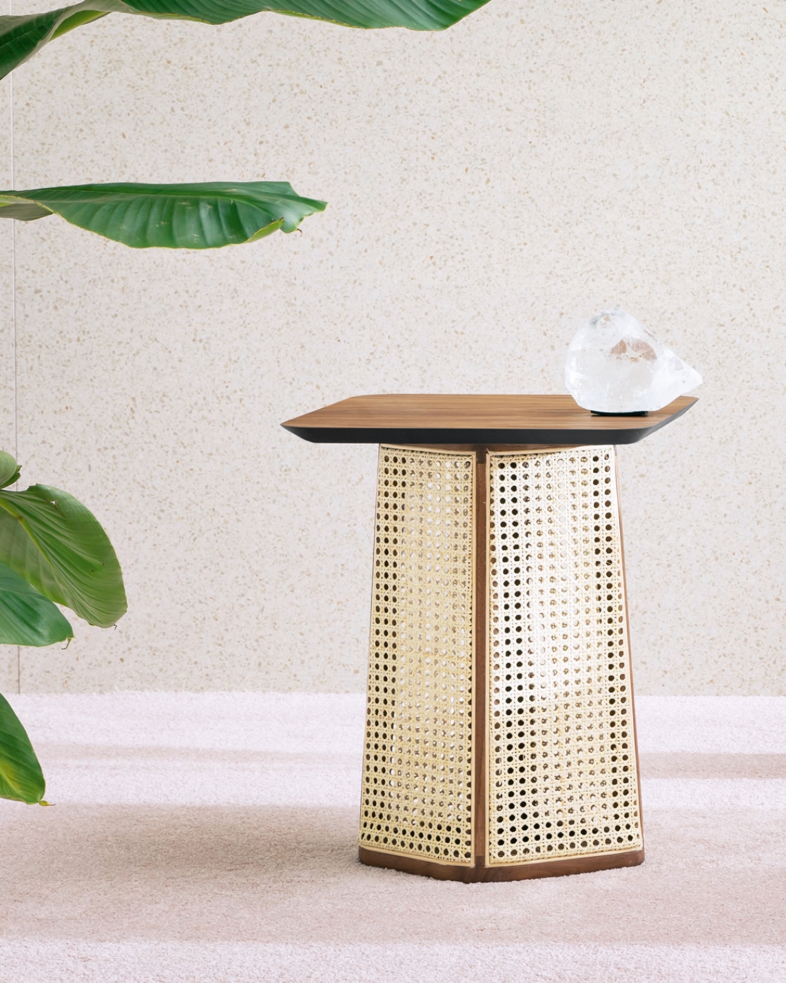 A pair of tables that maintain the spirit of the dining table. The cane tightens around the base, whilst the thickness of the top highlights the potential for our wood.