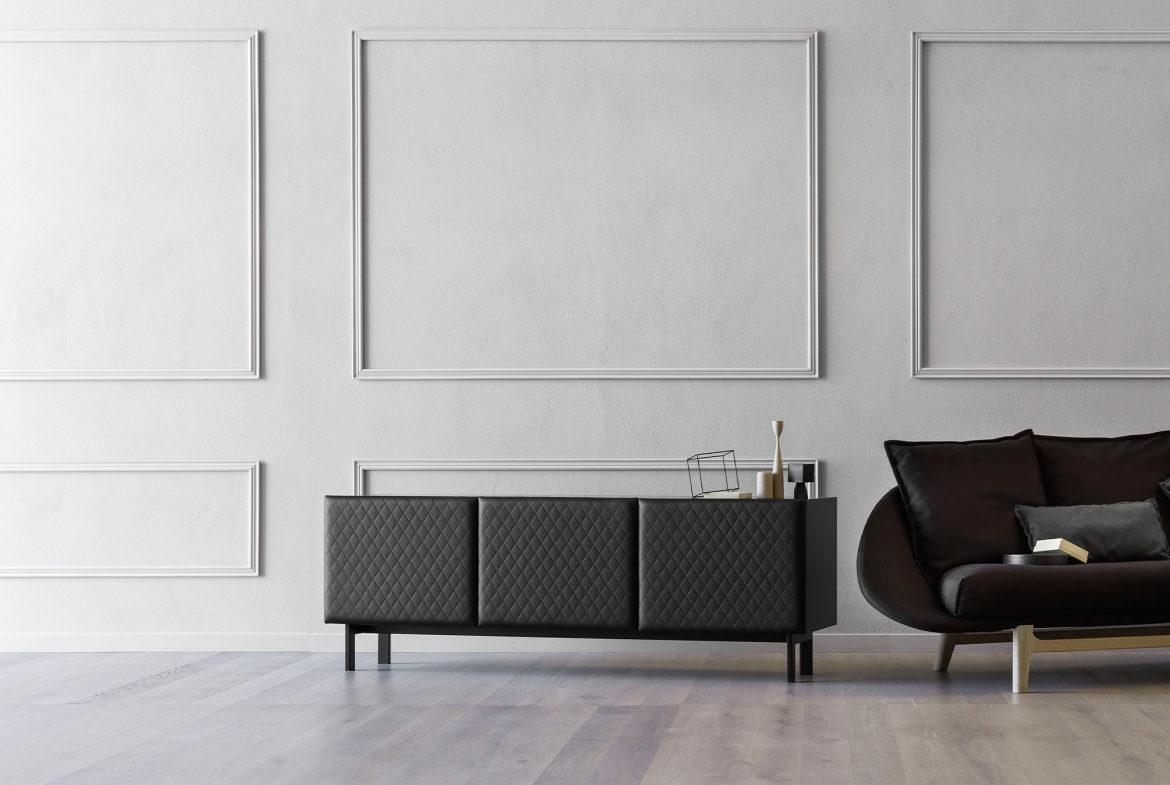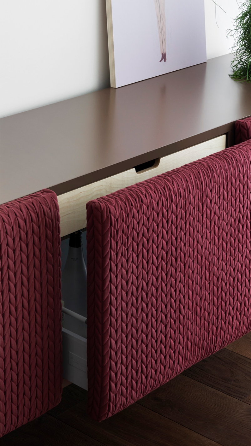 Elegant in name and shape, the sideboard is characterized by padded doors, with a precious diamond-patterned embroidery. It is a bourgeois element that brings attention to itself.