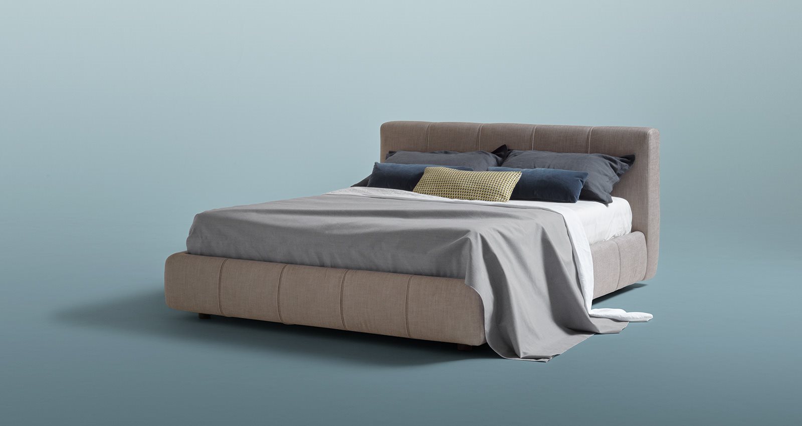 A bed which stands out for the elegance of its proportions and the remarkable soft shape. The headboard and base feature meticulous sartorial working which creates a unique, distinctive design.